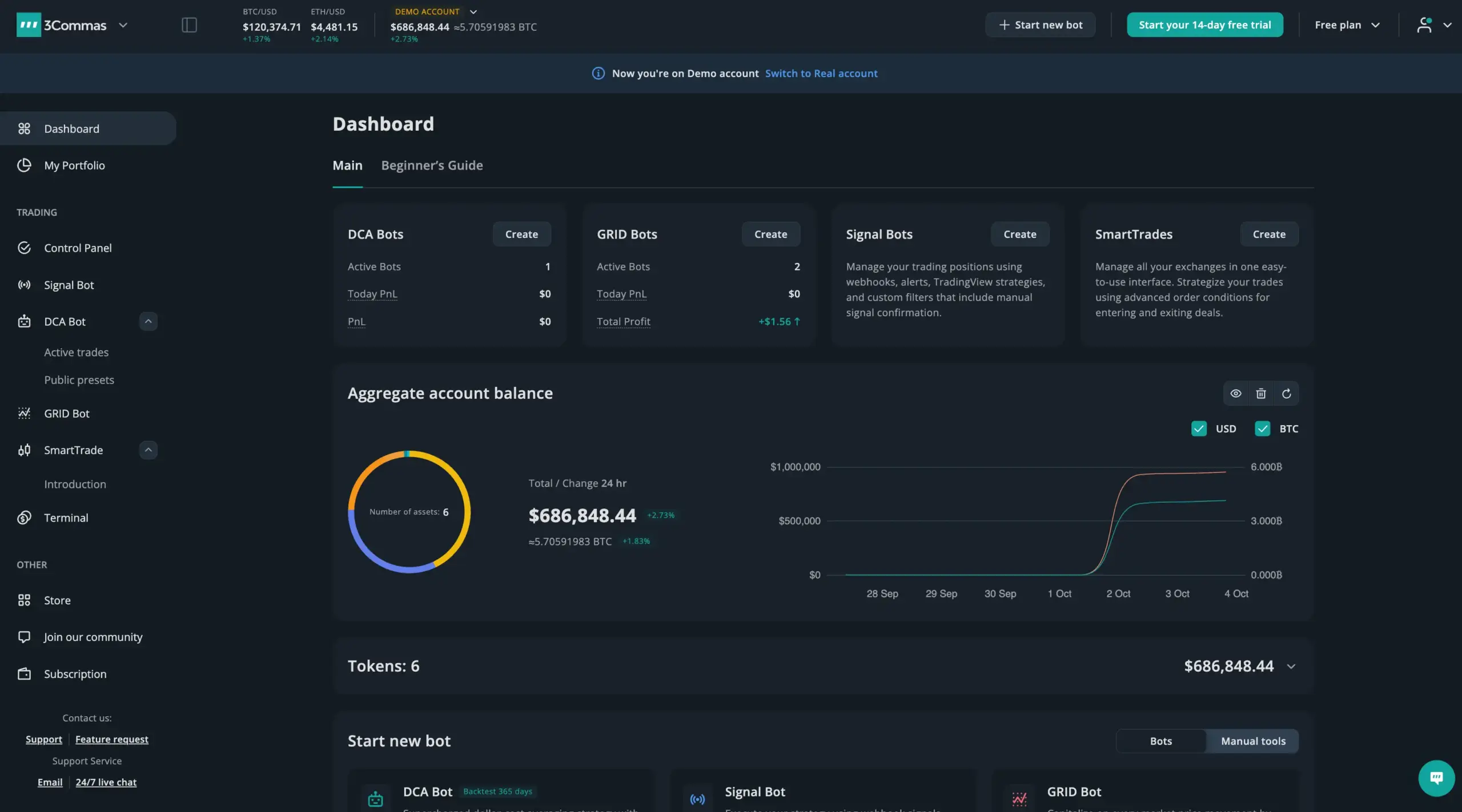 3Commas fügt alle verbundenen Börsen in einem Dashboard. Du siehst Gesamtwert, Asset-Verteilung und Performance über alle Accounts hinweg. Die Plattform aktualisiert Balances via API in Echtzeit, sodass du immer den aktuellen Stand hast.