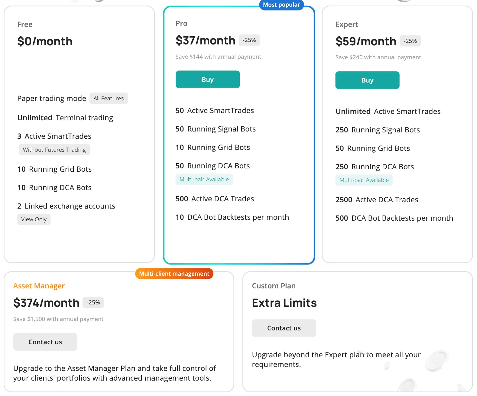 - Free Plan mit Demo-Zugang: Unbegrenztes Paper Trading und je ein DCA/Grid Bot kostenlos, kostenpflichtige Pläne ab 37 Dollar monatlich.