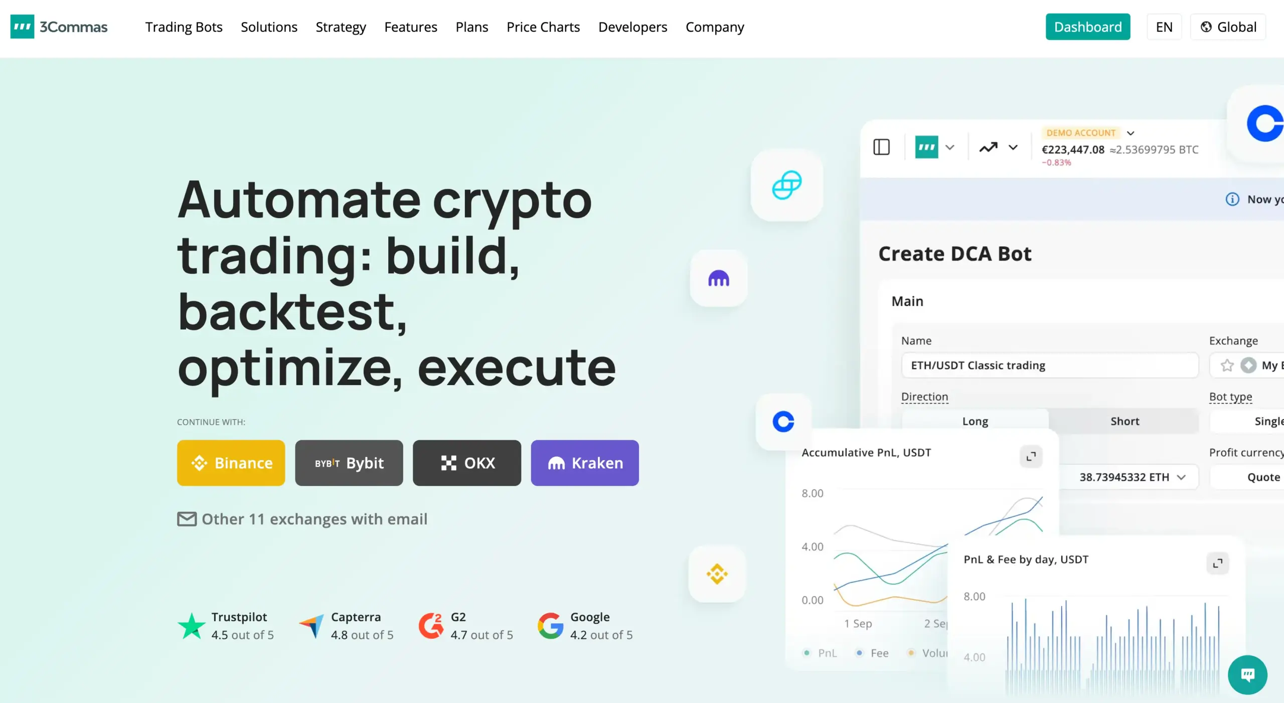 - Cloud-basierte Trading-Bot-Plattform: 3Commas verbindet sich über API-Schnittstellen mit 18 Kryptobörsen und führt Trades nach vordefinierten Regeln automatisch aus, ohne dass du aktiv handeln musst.