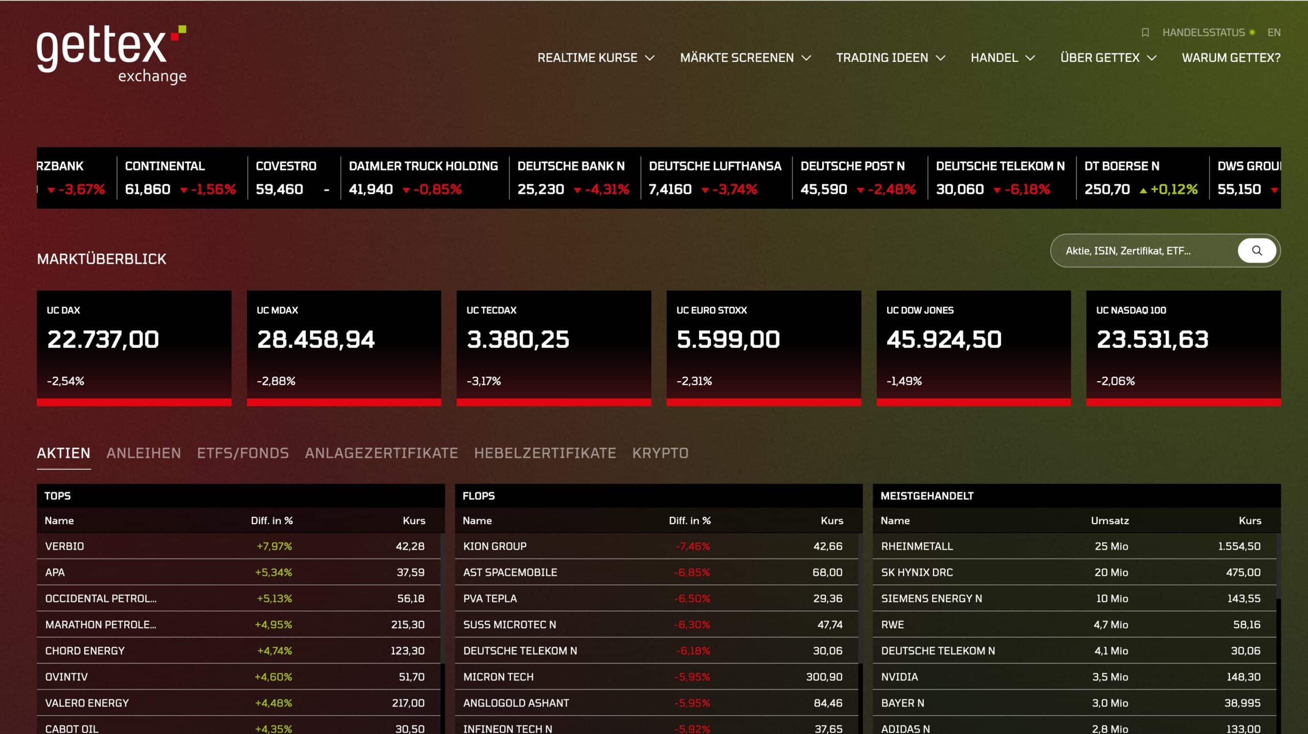 Realtime-Kursübersichten für Aktien, ETFs, Fonds, Anleihen und Krypto-ETPs — inklusive Tops, Flops und meistgehandelte Werte des Tages.