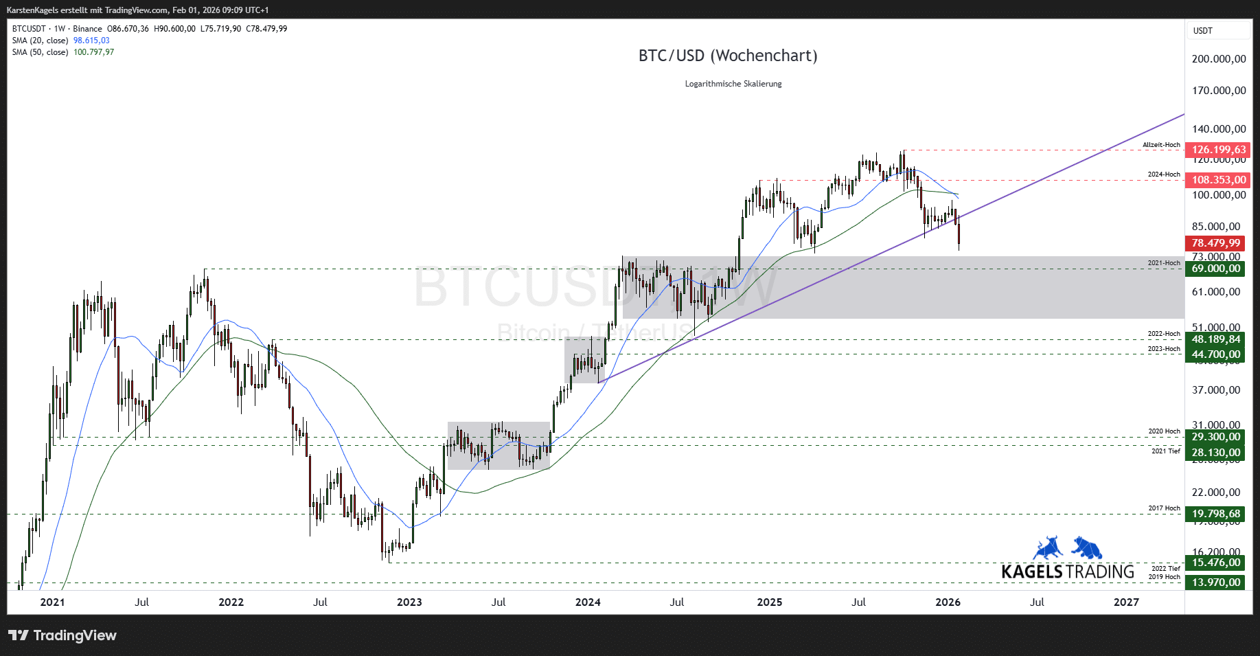 Die Zone an der $70.000er Marke dürfte stärkere Verluste abfedern, erst ein Bruch würde den Ausblick deutlich eintrüben und auch den $50.000er-Bereich wieder ins Spiel bringen.