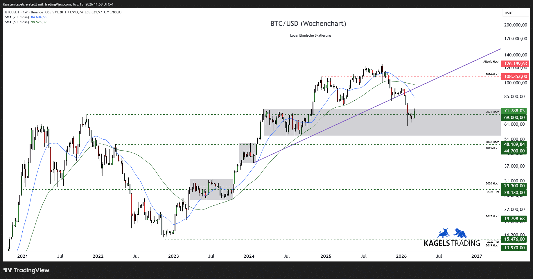 Im November 2024 konnte auch diese nach oben verlassen werden, woraufhin der Bitcoin im Januar 2025 ein Hoch bei $109.588 setzen konnte. Hier ist Korrekturstimmung in den Markt gekommen, die am 50-Wochen-Durchschnitt auf Unterstützung getroffen ist. Seit Mitte April 2025 befindet sich der Kurs in einem Aufwärtstrend, der ein neues Allzeithoch bei 126.199 gesetzt hat, in der laufenden Korrektur aber unter $70.000 zurückgekommen ist.