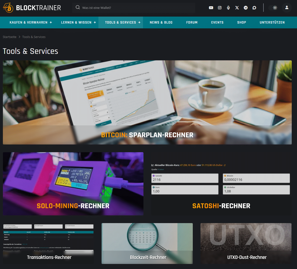Im Bereich Tools & Services stellt Blocktrainer nützliche Anwendungen, Rechner und Hilfsmittel rund um Bitcoin bereit. Dazu gehören zum Beispiel: