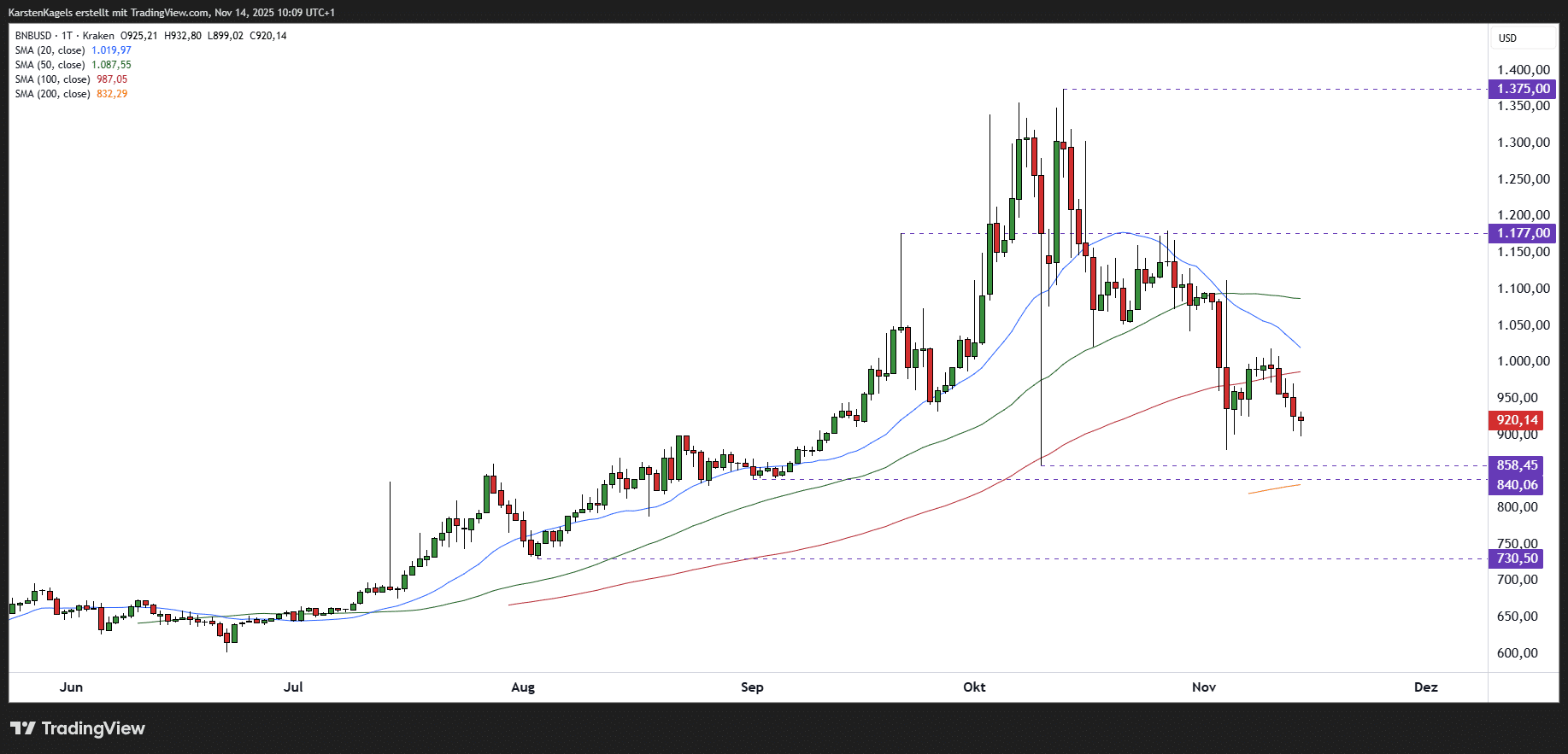 Rückblick: Der stabile Aufwärtstrend im BNB/USD markierte in einer volatilen Phase der ersten Oktoberhälfte sein Allzeithoch bei $1.375. Aus der Topbildung hat sich eine Abwärtstrendstruktur ergeben, die nach Bruch der 100-Tage-Linie auf Unterstützung bei $850 zielt.