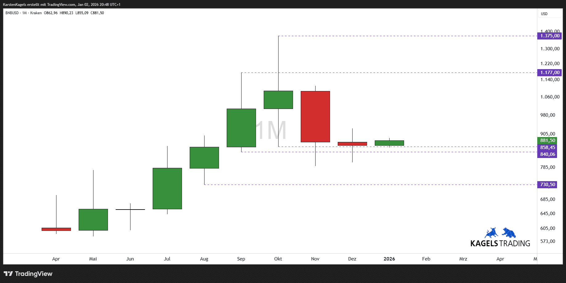 Rückblick: Der noch junge Chart des Binance Coins zeigt eine Serie ansteigender Monatshochs sowie höhere Tiefs. Vom Oktoberhoch bei $1.375 ist der Kurs jedoch deutlich zurückgekommen und notiert zum Analysezeitpunkt unter der $900er-Marke.