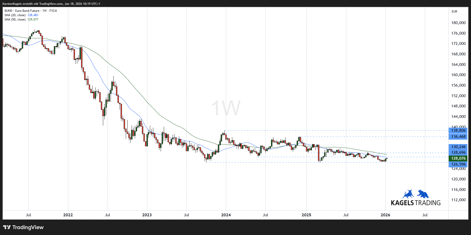 Rückblick: Der abgebildete Wochenchart bildet die Kursentwicklung des Bund Futures seit dem Jahr 2021 ab. Nachdem das Jahr 2022 von stärkeren Verlusten geprägt war, deutet sich seit 2023 eine Bodenbildung an. Hier scheint die untere Grenze bei 126 Punkten zunächst Unterstützung zu bieten.