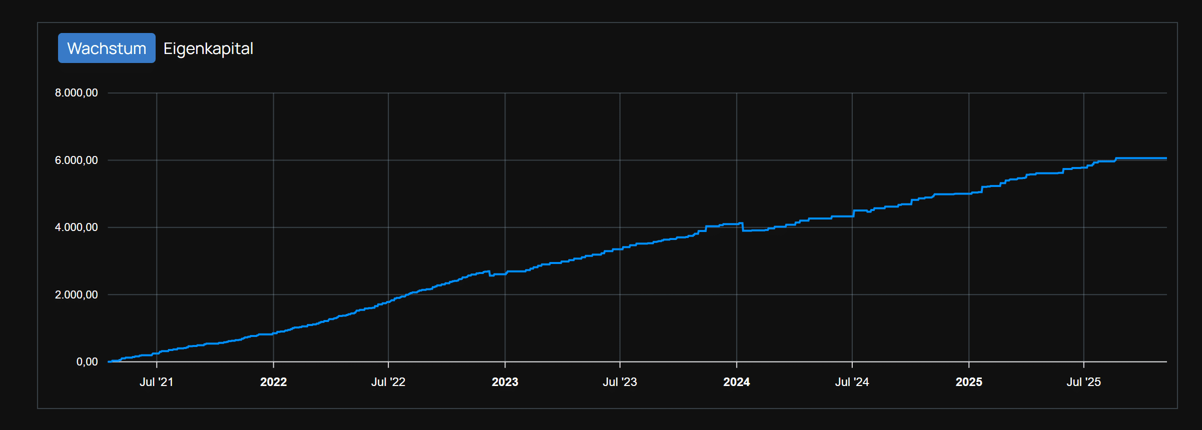 Zusätzlich zeigt die Plattform für jede Strategie (wir blieben bei Sputnik) eine Wachstums- und Eigenkapitalkurve. Diese visualisiert den Verlauf der Handelsergebnisse über mehrere Jahre hinweg. Das Beispiel einer Strategie zeigt ein stetig ansteigendes Wachstum seit Juli 2021 bis Mitte 2025, mit vereinzelten Phasen seitlicher Konsolidierung.