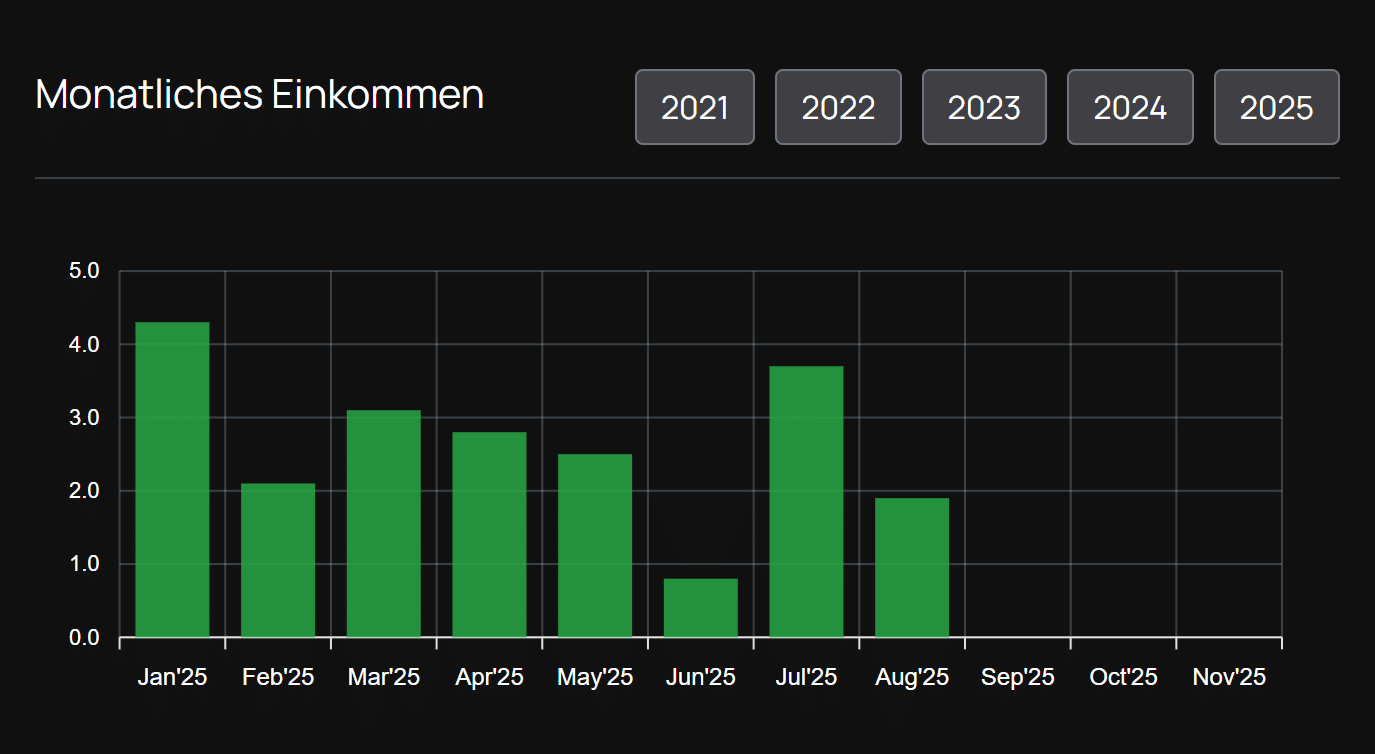 Das Beispiel für das Jahr 2025 zeigt eine variable Ertragsentwicklung mit positiven Ergebnissen in nahezu allen Monaten. Der höchste Monatswert liegt im Januar 2025 bei rund 4,3 %, während die schwächsten Monate im Bereich von unter 1 % liegen. Im Durchschnitt bewegen sich die monatlichen Ergebnisse zwischen 2 % und 3 %.