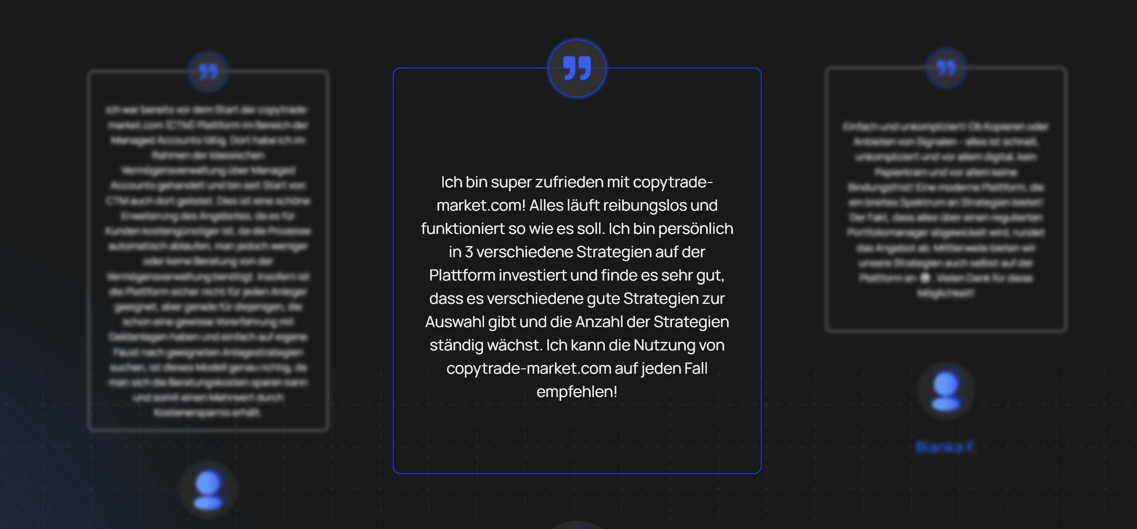Auf der offiziellen Website von CopyTrade Market finden sich mehrere positive Kundenstimmen, die die Plattform als zuverlässig, modern und unkompliziert beschreiben. Diese Aussagen klingen professionell formuliert und zeichnen ein durchweg positives Bild. Allerdings lässt sich nicht überprüfen, ob diese Bewertungen von echten Nutzern stammen, da keine Verifizierung oder Verlinkung zu unabhängigen Profilen erfolgt.
