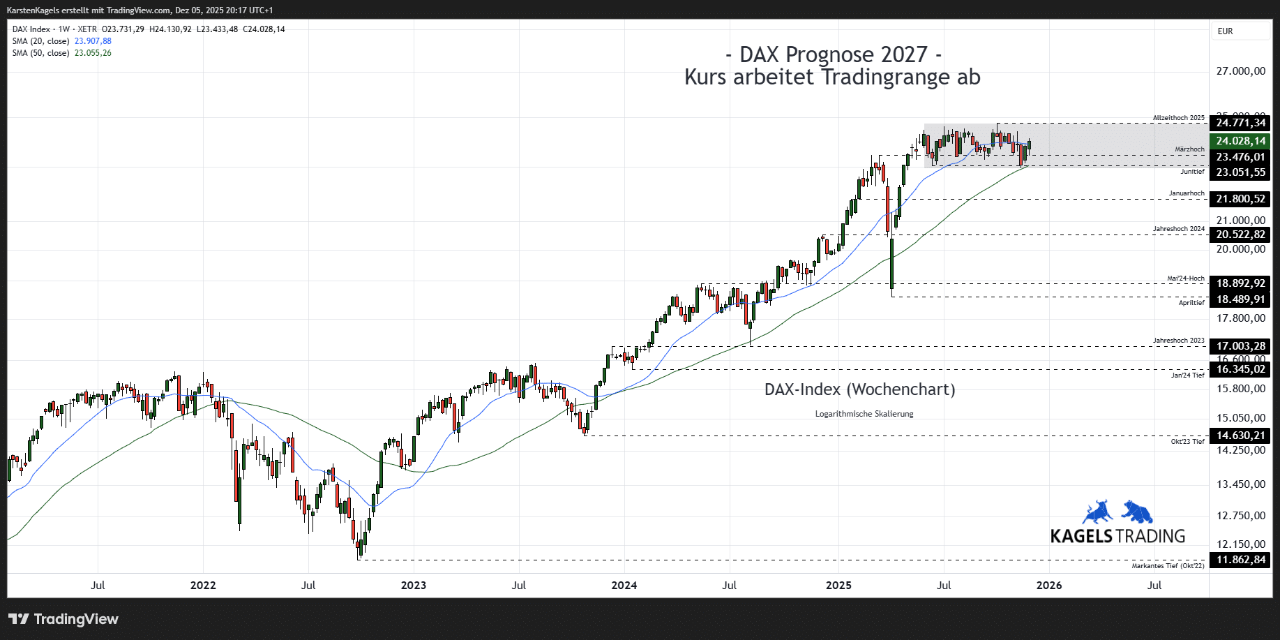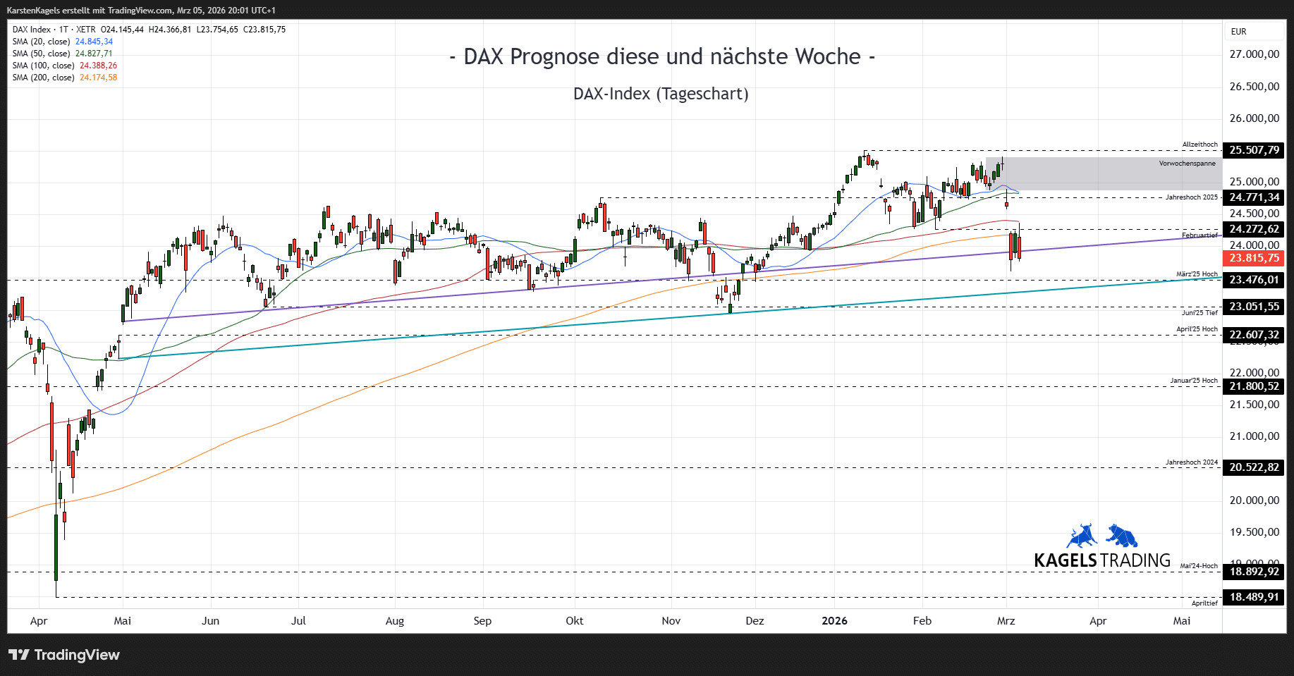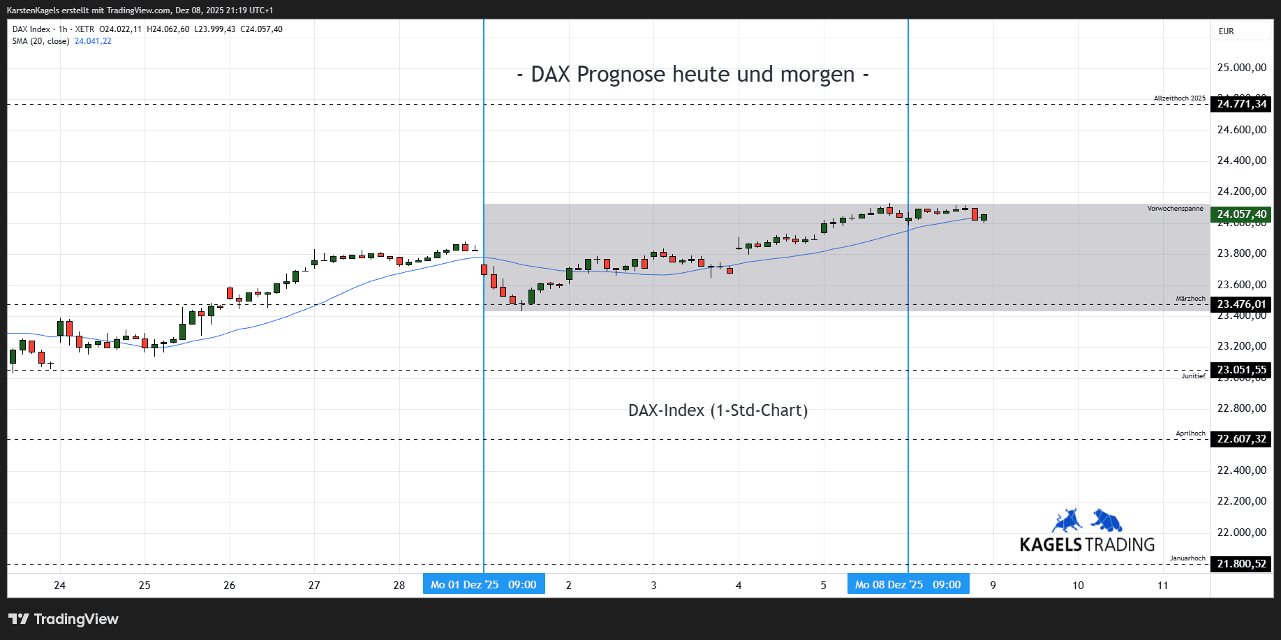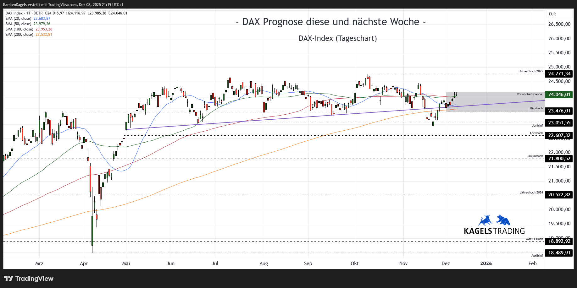 Unter Berücksichtigung der Wirtschaftstermine, an denen mit erhöhter Volatilität zu rechnen ist, erstelle ich die DAX Prognose für die kommenden Tage. Ebenso skizziere ich unter Einbeziehung relevanter Indikatoren – wie beispielsweise den gleitenden Durchschnitten und Fibonacci-Retracements – mögliche Kursverläufe für die aktuelle und die kommende Woche.