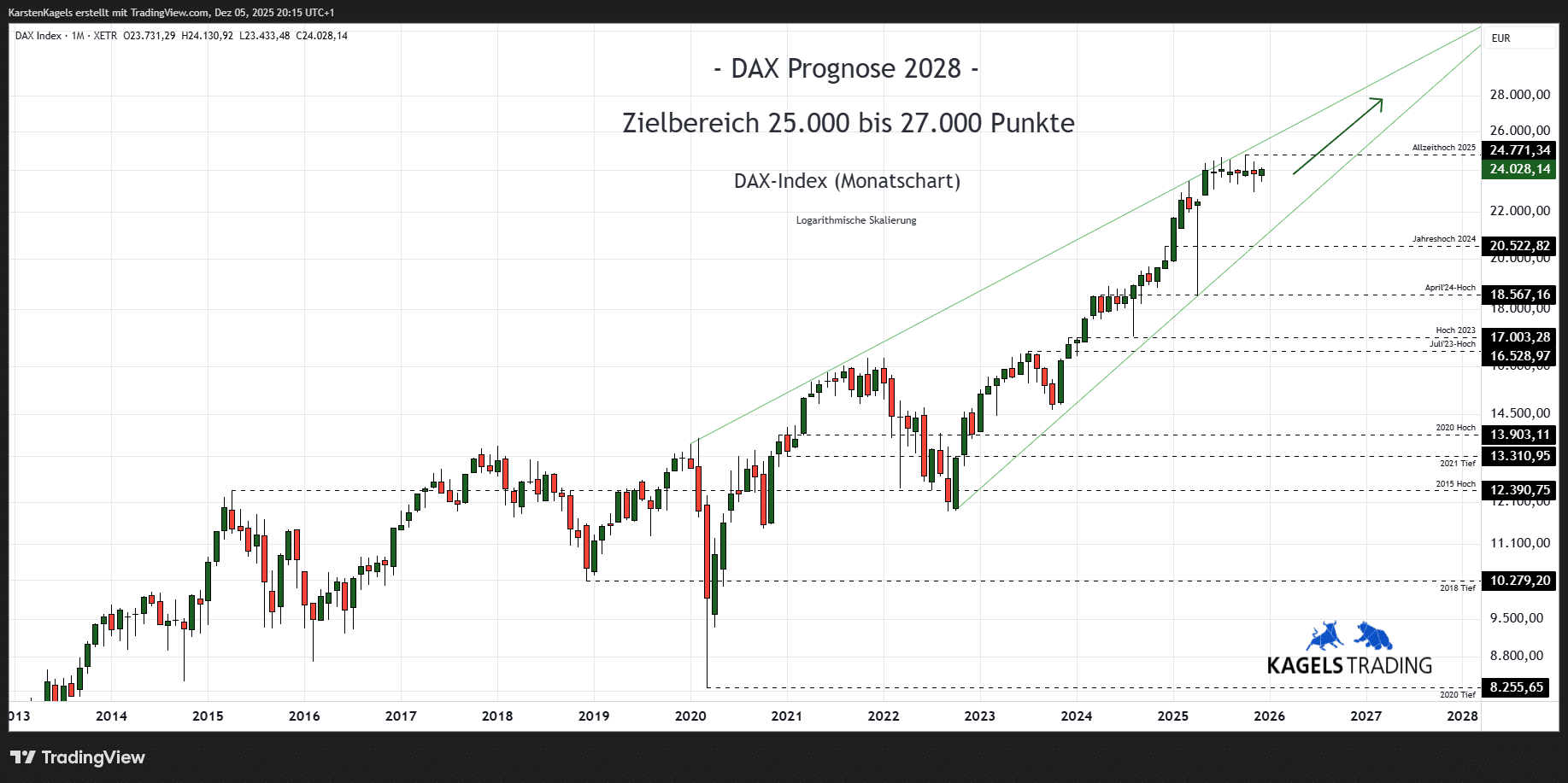 Die Jahreskerze 2030 könnte demnach im Hoch schon an der 30.000-Punkte-Marke kratzen, wobei im Tief aus der DAX-Prognose heraus auch 18.000 Zähler möglich wären.