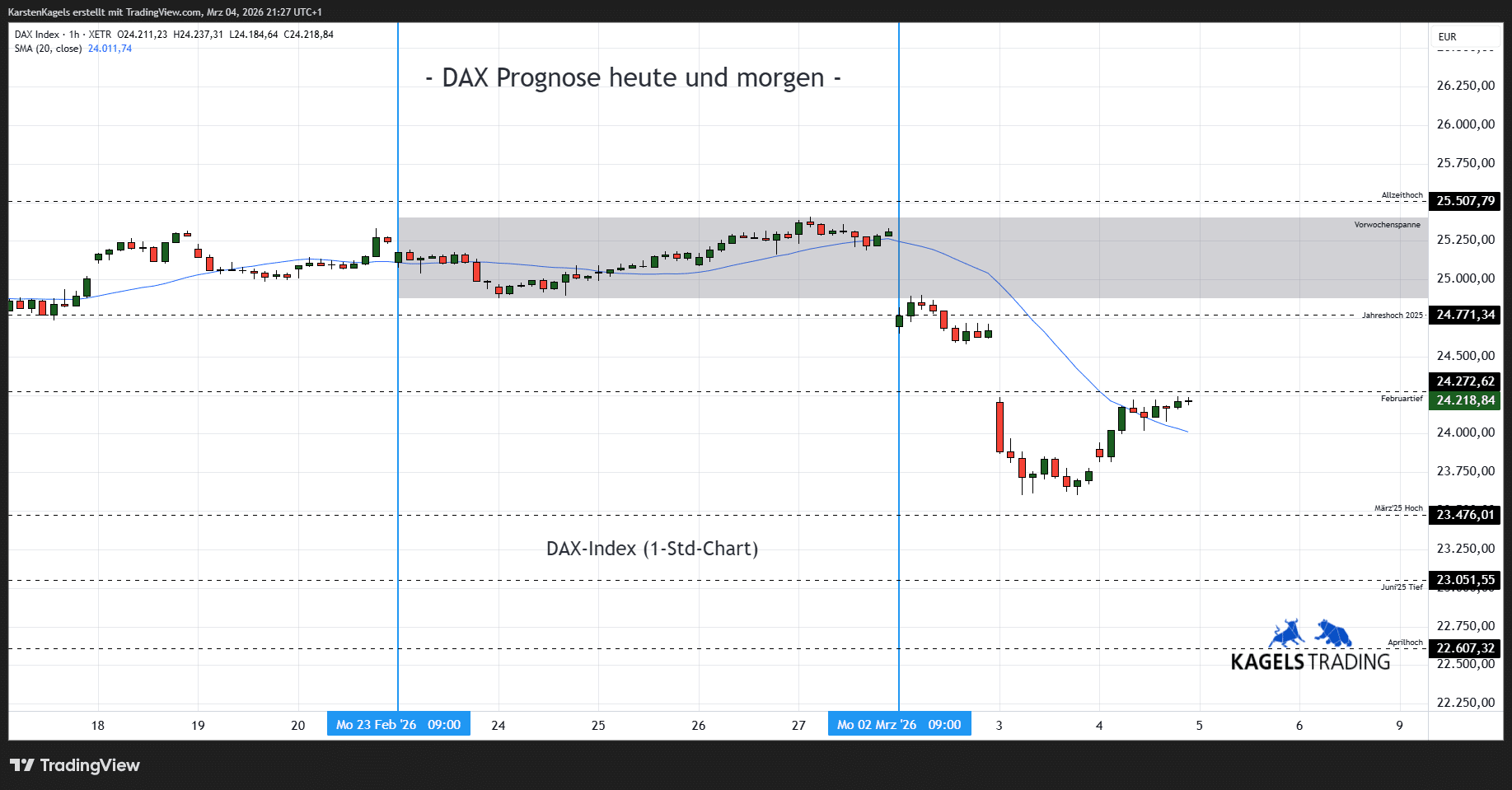 Für die kurzfristigen Prognosen (heute, morgen, diese Woche, nächste Woche) greife ich in der Regel auf den Stundenchart (H1) und Tageschart des DAX-Index (Xetra, Kassa) zurück.