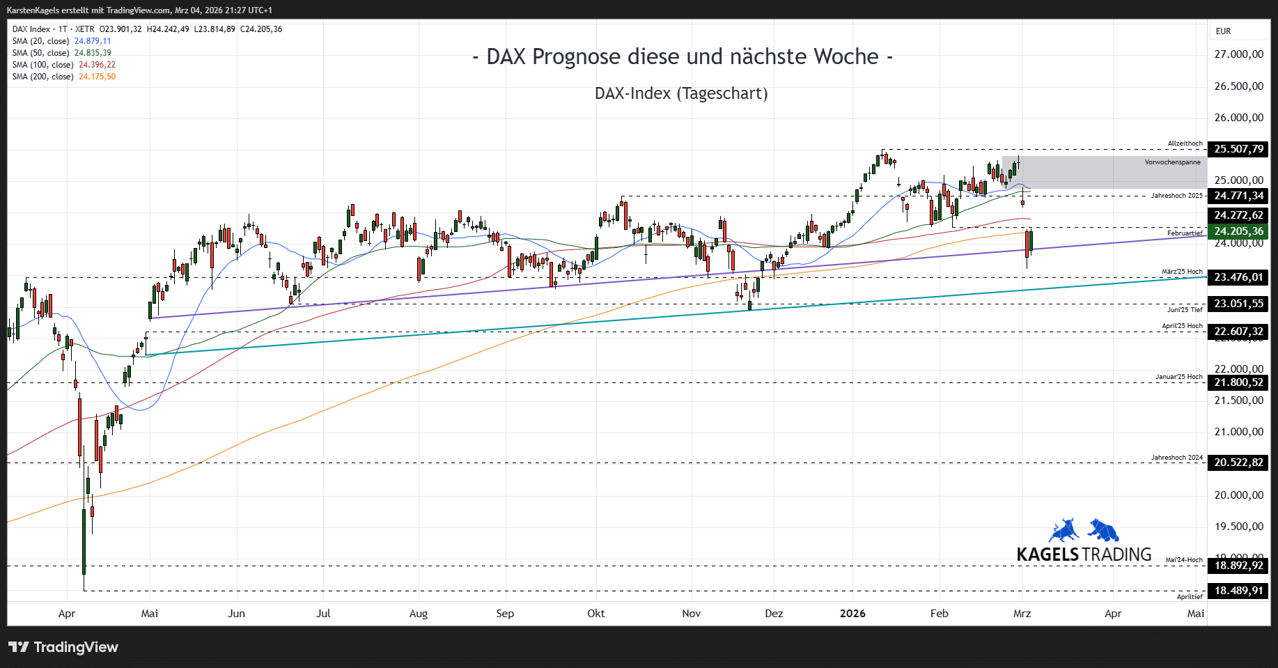 Abhängig von der Entwicklung in der Vorwoche dürfte sich zeigen, wie weit der Korrekturdruck nach Bruch des 24.000er-Bereichs den Kurs noch fallen lässt. Sollte sich bereits eine Lösung des Iran-Konflikts abzeichnen, könnten sich die Notierungen an der 200-Tage-Linie stabilisieren.