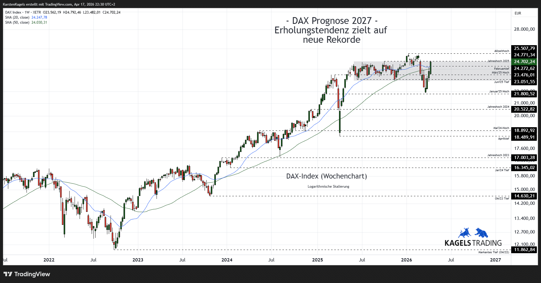 - DAX Aussichten 2027–2028: Aufwärtstrendstruktur übergeordnet intakt. Kursziel 27.000–28.000 Punkte.
