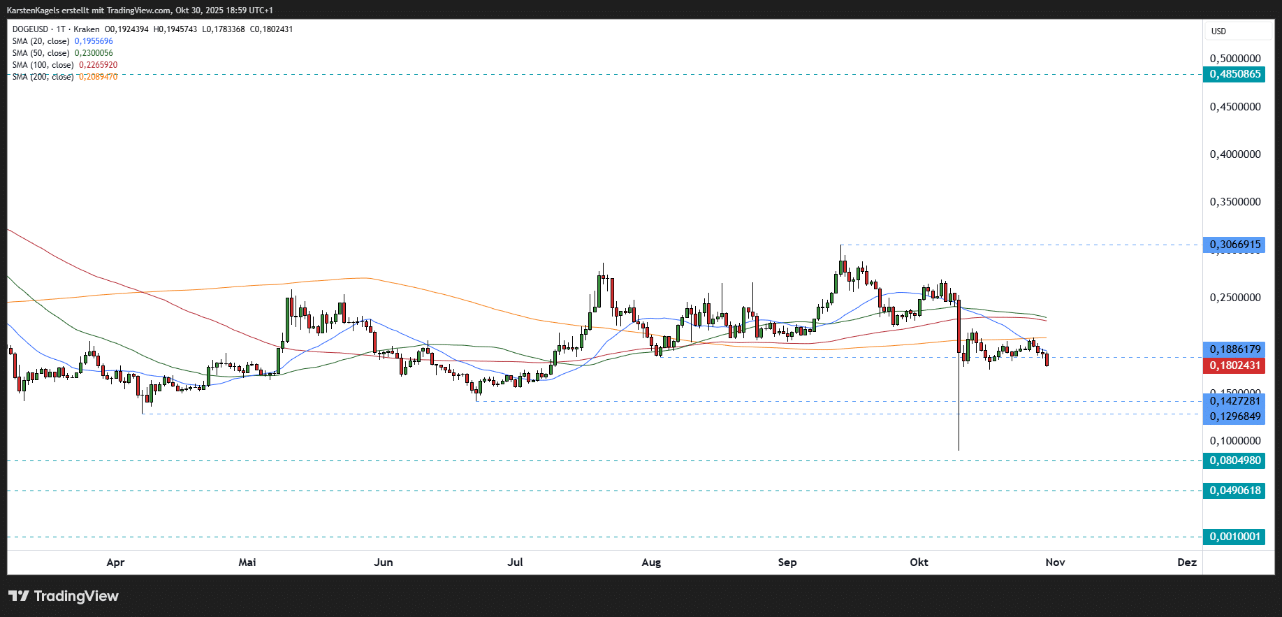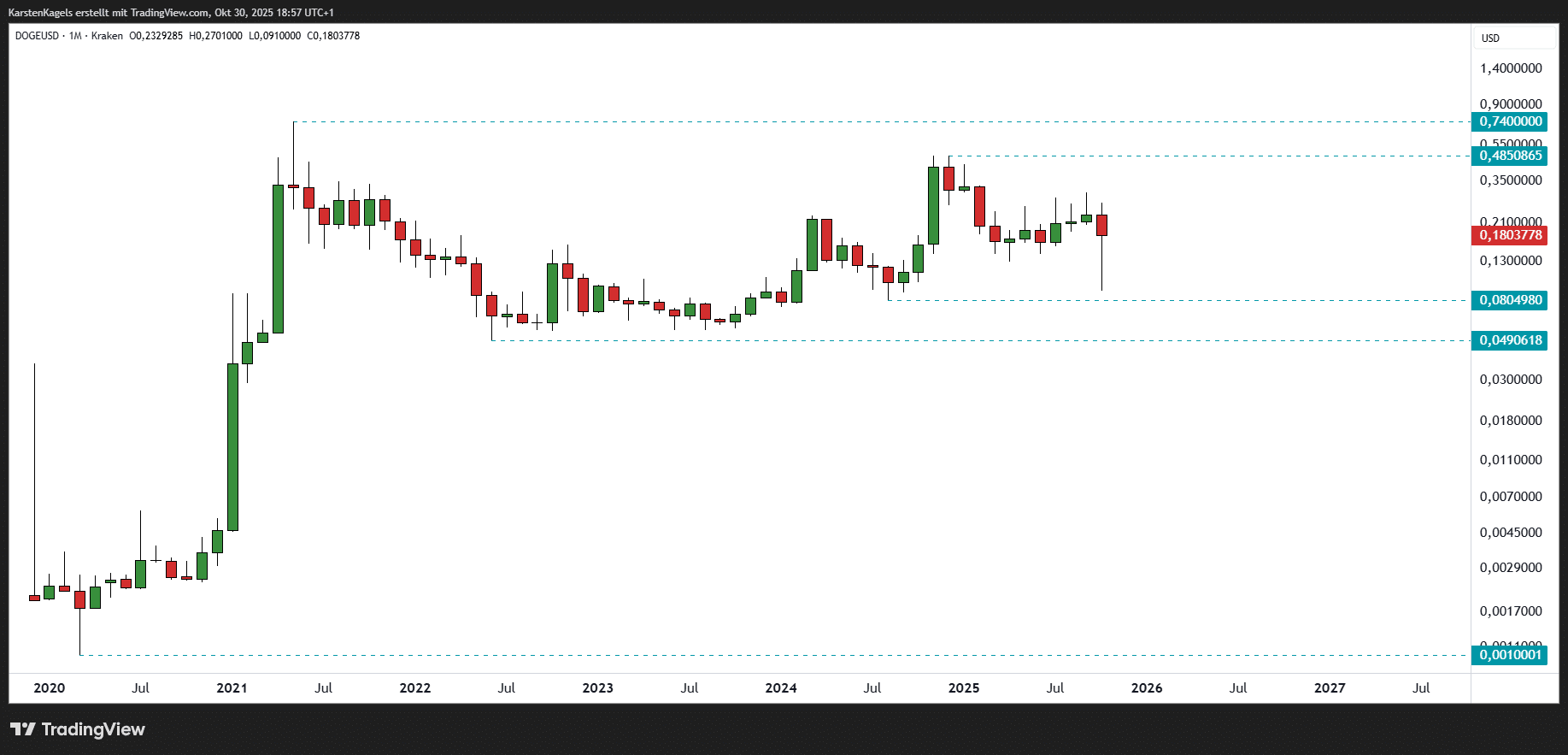 Rückblick: In den Monatskerzen hat der DOGE-Kurs seit Mai 2021 eine Spanne zwischen dem Allzeithoch bei $0,74 und dem lokalen Tief aus Juli 2022 ($0,05) abgearbeitet. Das jüngste lokale Hoch liegt bei $0,48 und definiert einen Widerstandsbereich. Die Zone zwischen 0,08 und 0,09 hat den jüngsten Abwärtsimpuls im Oktober 2025 aufgefangen und wirkt dadurch als Unterstützung.