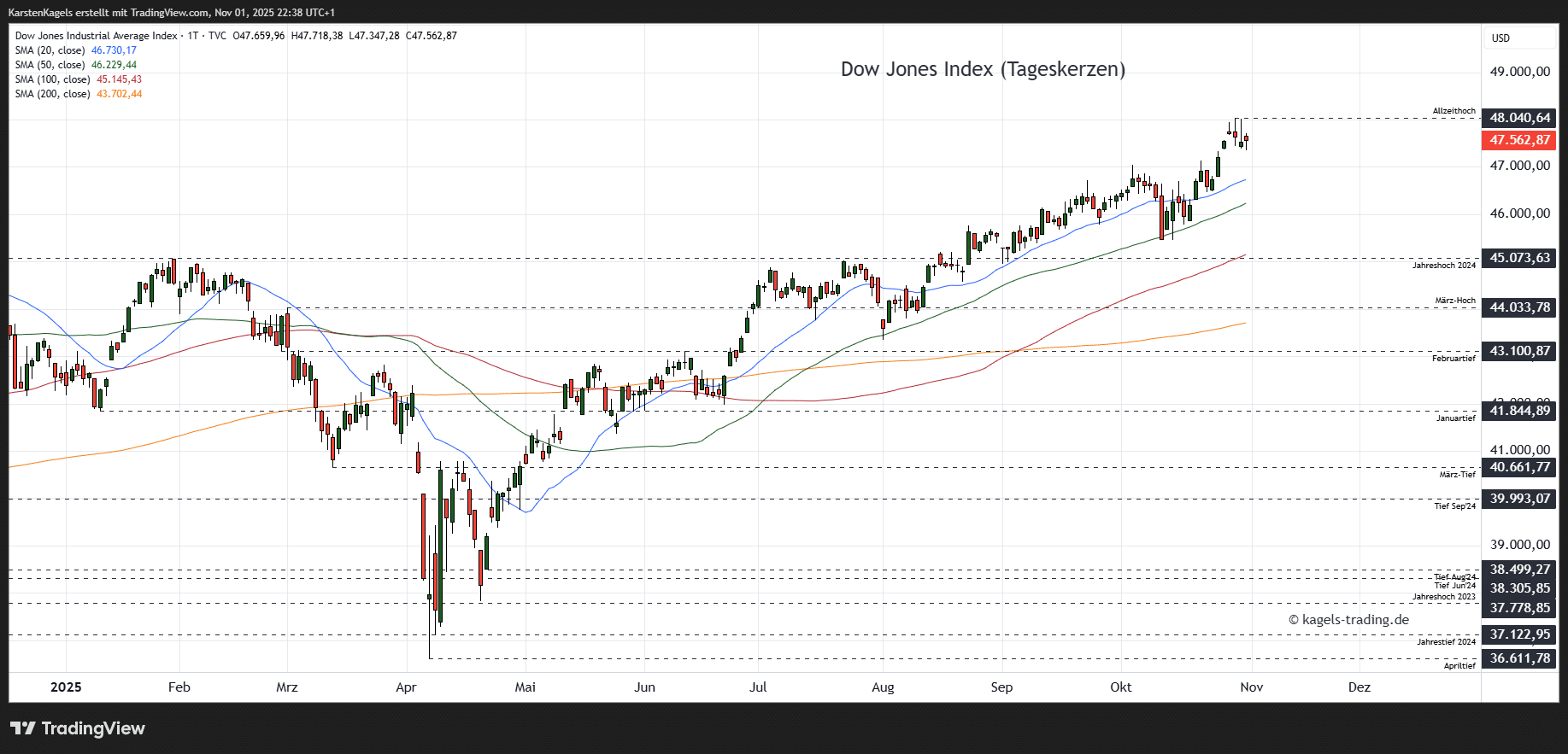 • Kurzfristige Dow Jones Prognose: Nachdem sich der Dow Jones Index in einer starken Korrektur am Vorjahrestief stützen konnte, hat der Kurs wieder nach oben gedreht und in der seit April laufenden Rallye die 48.000-Punkte-Marke überschritten, wo Anschlussgewinne zu erwarten sind.