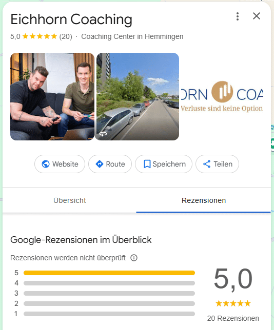 Eichhorn Coaching führt eine Reihe von Kundenmeinungen auf der eigenen Website an, aber auch bei ProvenExpert ist das Unternehmen gelistet und erreicht dort einen sehr guten Schnitt. Momentan findet sich die letzte Bewertung aus dem Dezember 2024.