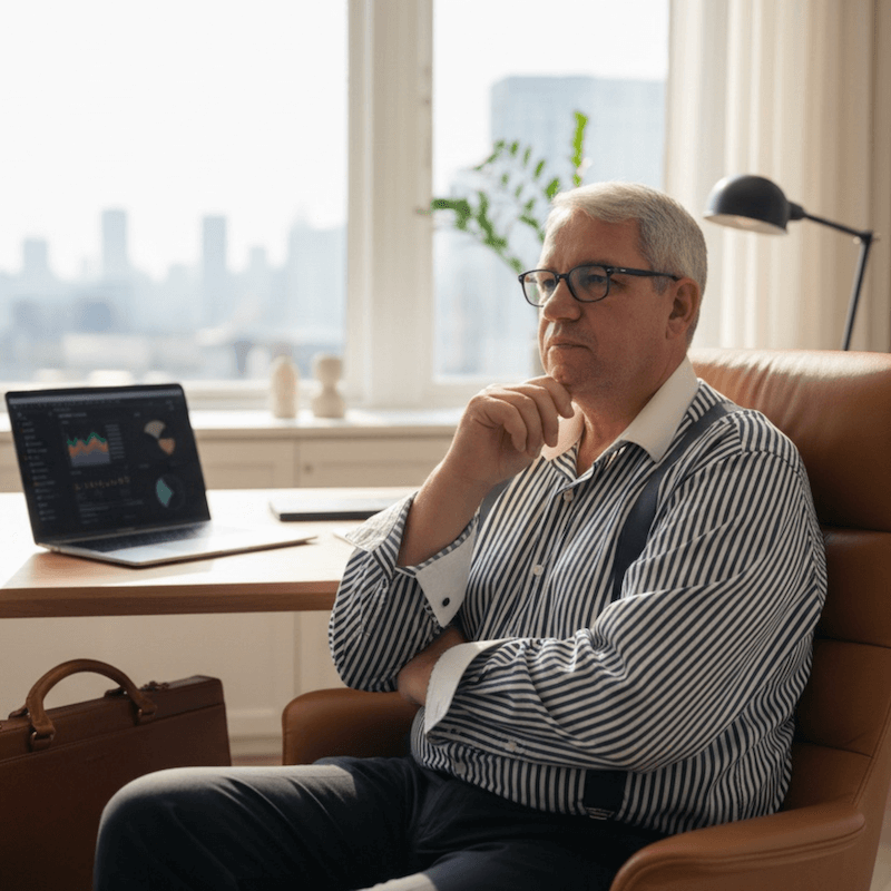 frank schuh von elliottwaver.live in einem sessel nachdenkend am laptop