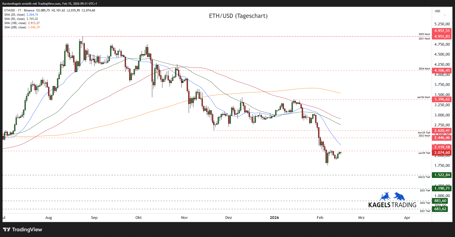 - Ethereum Prognose kurzfristig: Nach der Erholung über das 2022er-Jahreshoch zeigt der Kurs vom Test der $5.000er-Marke Korrekturbedarf. Die kurzfristige Abwärtstrendstruktur könnte sich unter den nahen Durchschnitte in Richtung der $1.500er-Marke fortsetzen.