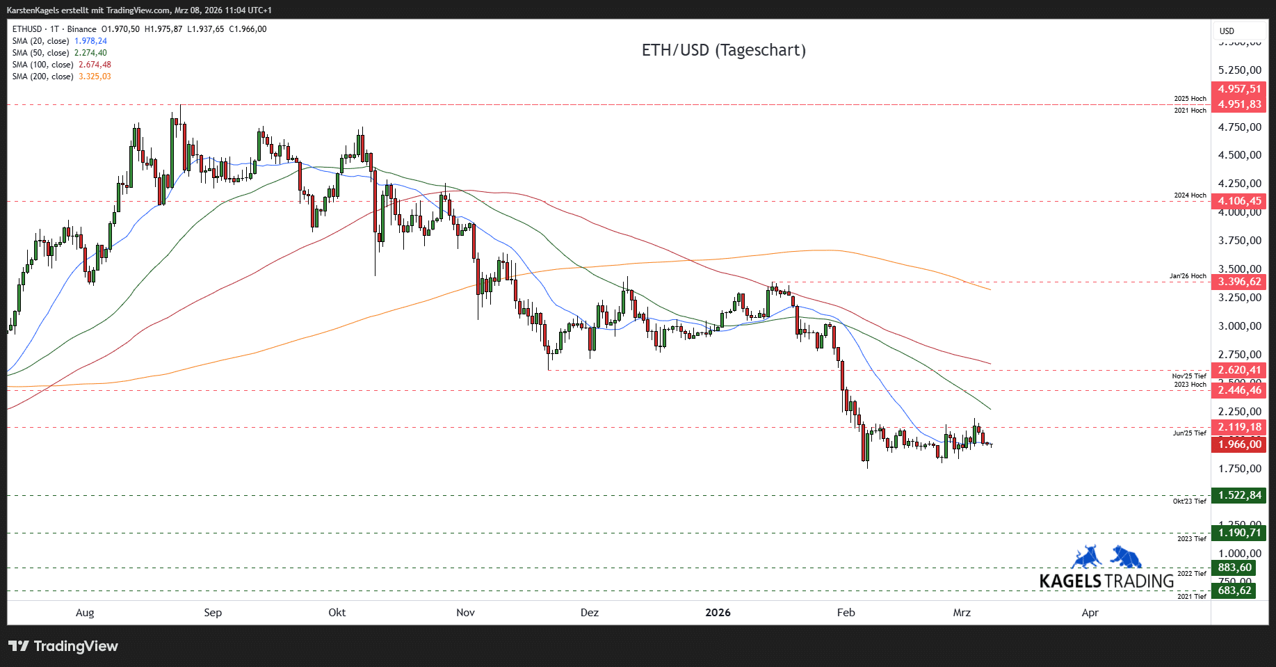 Mittelfristige Prognose: Zum Start in das Jahr 2025 hat ein stärkerer Korrekturimpuls die Unterstützung im $1.500er-Bereich etabliert. Hier ist genügend Nachfrage für eine Rückkehr in die 2024er-Jahresspanne präsent gewesen, wobei das Chartbild seit dem Hoch aus 2021 in einer breiten Seitwärtsphase zwischen $1.000 und $5.000 läuft. Der dortige Widerstand hat auch die jüngste Erholung zurückgewiesen, woraufhin der Kurs unter die 50-Wochen-Linie gefallen ist. Der Bruch unter $2.000 könnte weitere Schwäche erwarten lassen.