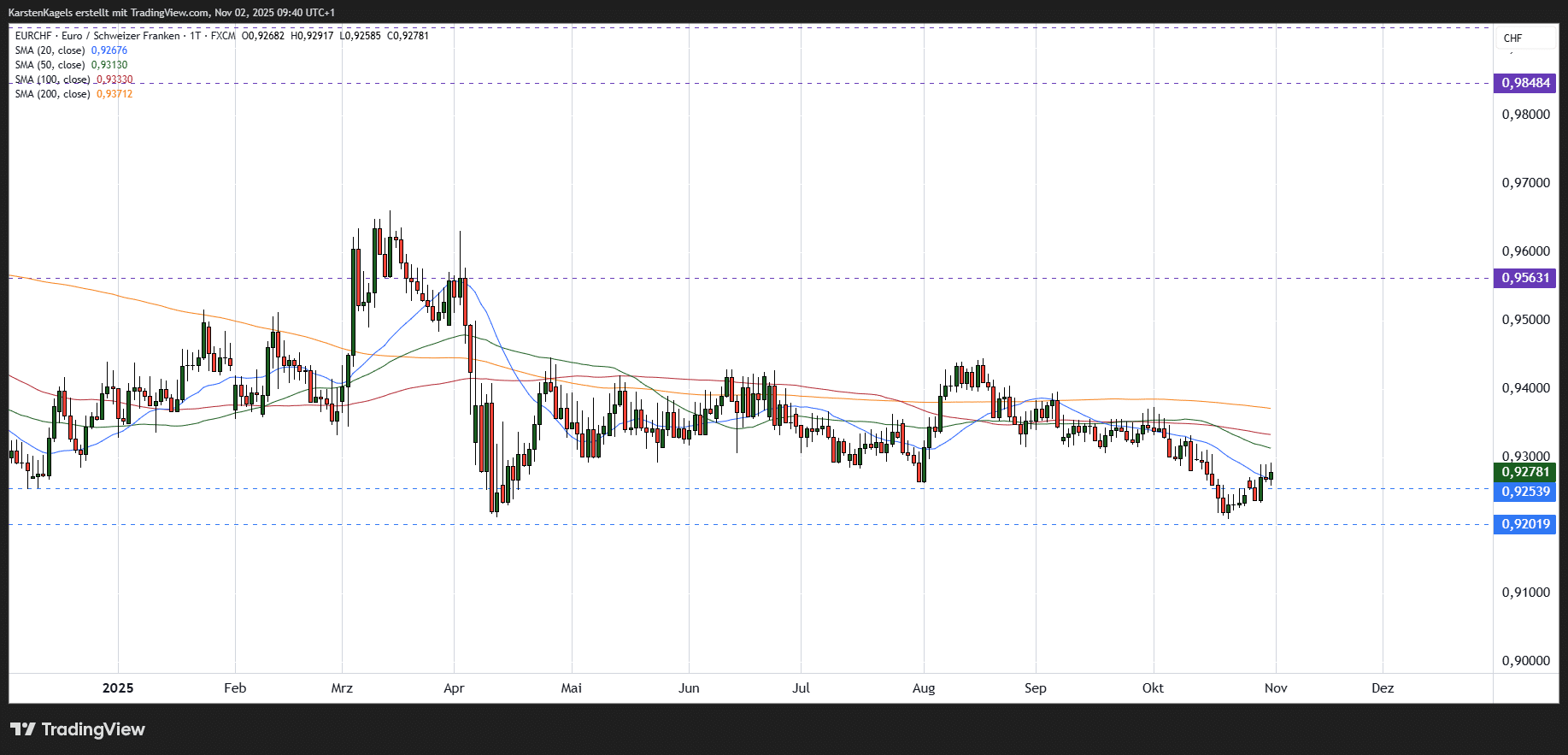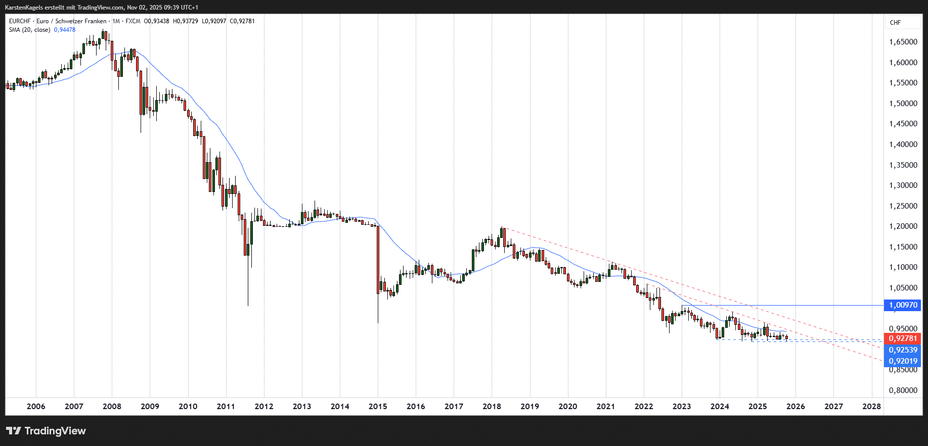 Eine hervorragende Übersicht über die technische Situation des Euro/Schweizer Franken Währungspaares findet sich hier auf TradingView.
