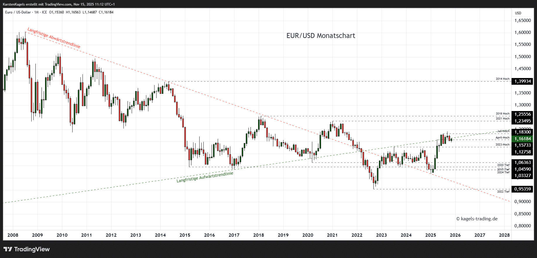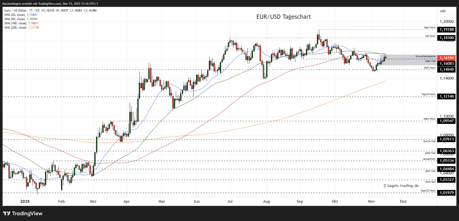 Update der EUR/USD-Prognose & Chartanalyse: 15.11.25 (11:21 Uhr) bei 1,1618
