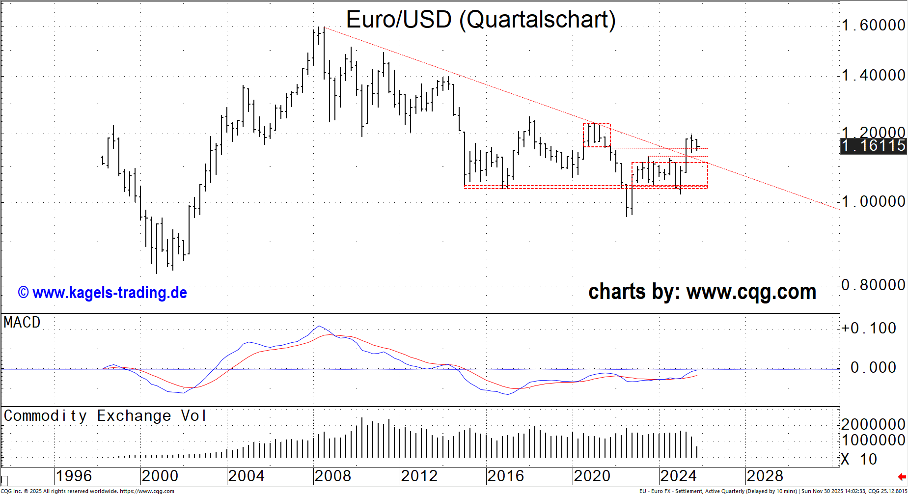 Aus der Perspektive des langfristigen Quartalscharts ist der Euro Future im April aus der eingezeichneten neutralen Seitwärtsbewegung nach oben ausgebrochen. Damit befindet sich der Euro Future aus Sicht der langfristigen Perspektive in einem etablierten Aufwärtstrend. Derartige junge Trends (April 2025) pflegen sich auch nach einer entsprechenden Korrektur oder Konsolidierung in der Regel weiter fortzusetzen, bis sehr gute Argumente gegen sie vorliegen – was aktuell im Chart noch nicht abzulesen ist. Somit bleiben die langfristigen Erfolgschancen weiter auf der Kaufseite. Weiter positiv zu bewerten ist die Tatsache, dass die seit 2008 bestehende, eingezeichnete langfristige Abwärtstrendlinie dynamisch überschritten wurde und bisher nicht wieder unterschritten wurde.