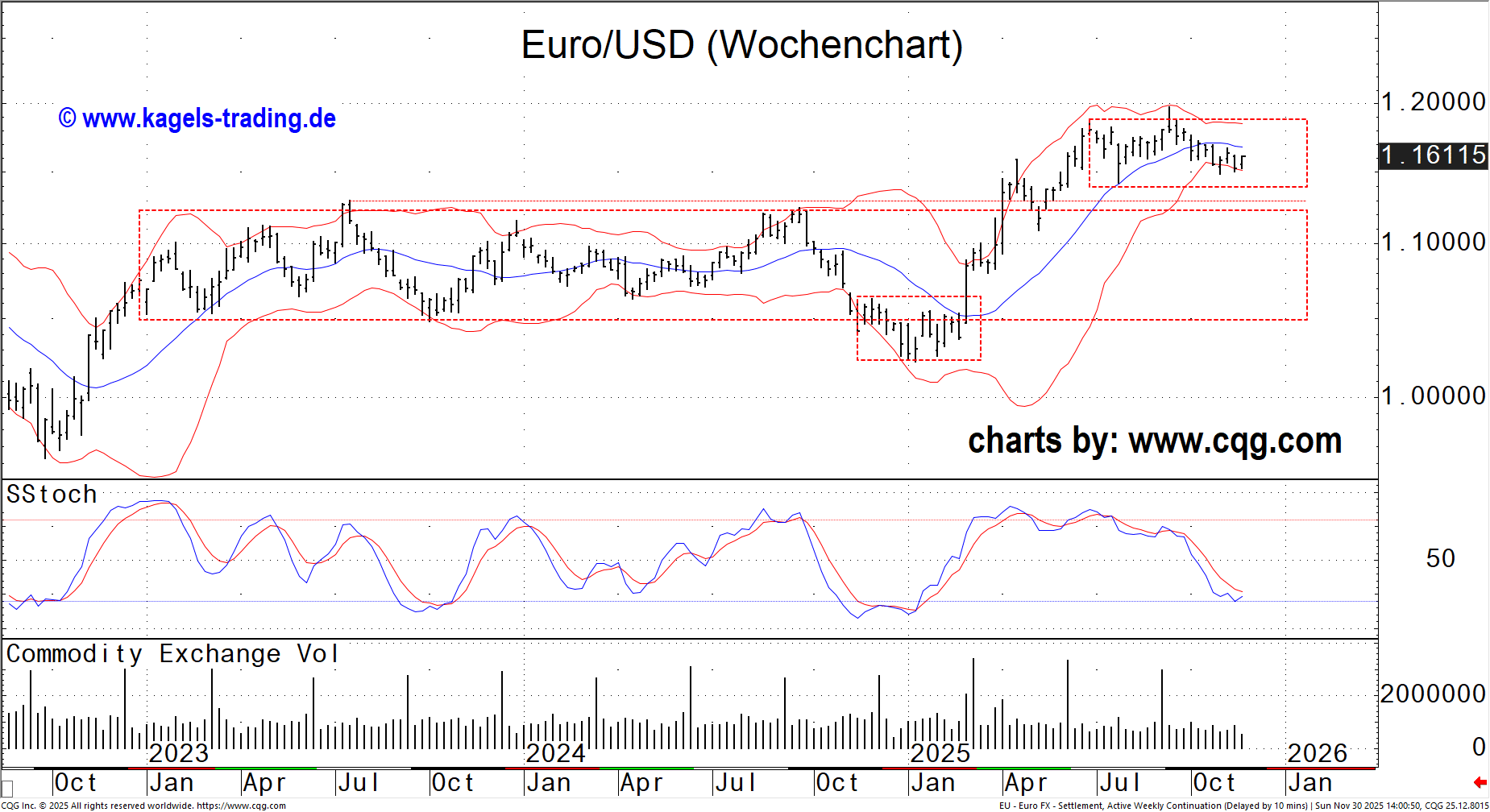 Aus der Perspektive des mittelfristigen Wochencharts ist der übergeordnete Aufwärtstrend in eine richtungslose, trendbestätigende Seitwärtsbewegung übergegangen. Bei Kursen über 1,17 ist ein Test der Widerstände dieser Konsolidierung um 1,18 bis 1,1980 anzunehmen. Kurse darüber, insbesondere im Zusammenhang mit der positiven Saisonalität, würden den primären Aufwärtstrend wieder durchsetzen. Der nächsthöhere stärkere Widerstandsbereich wäre bei diesem positiven Szenario um 1,2250, 1,2365 und 1,2580 zu beziffern.
