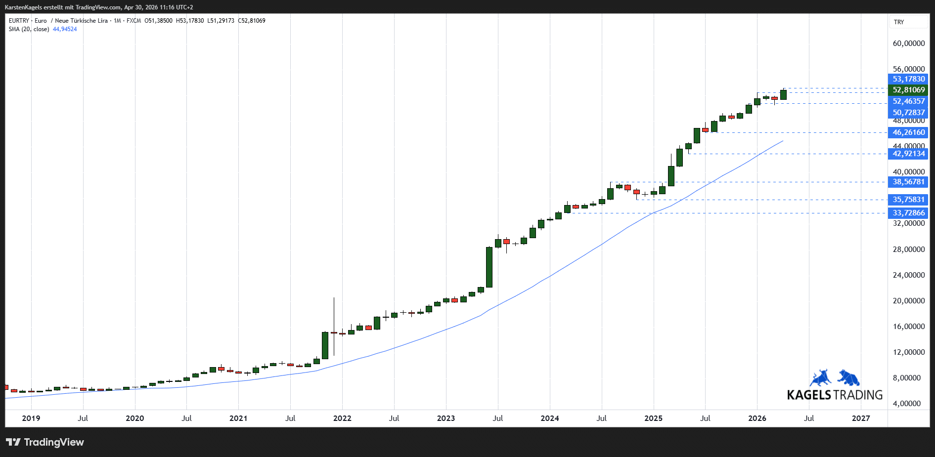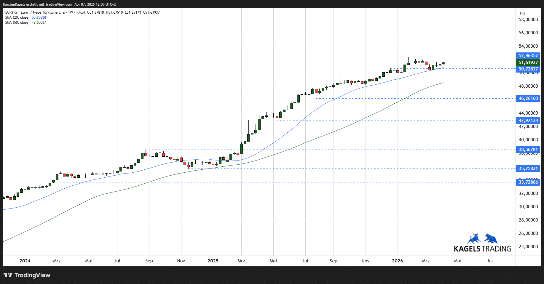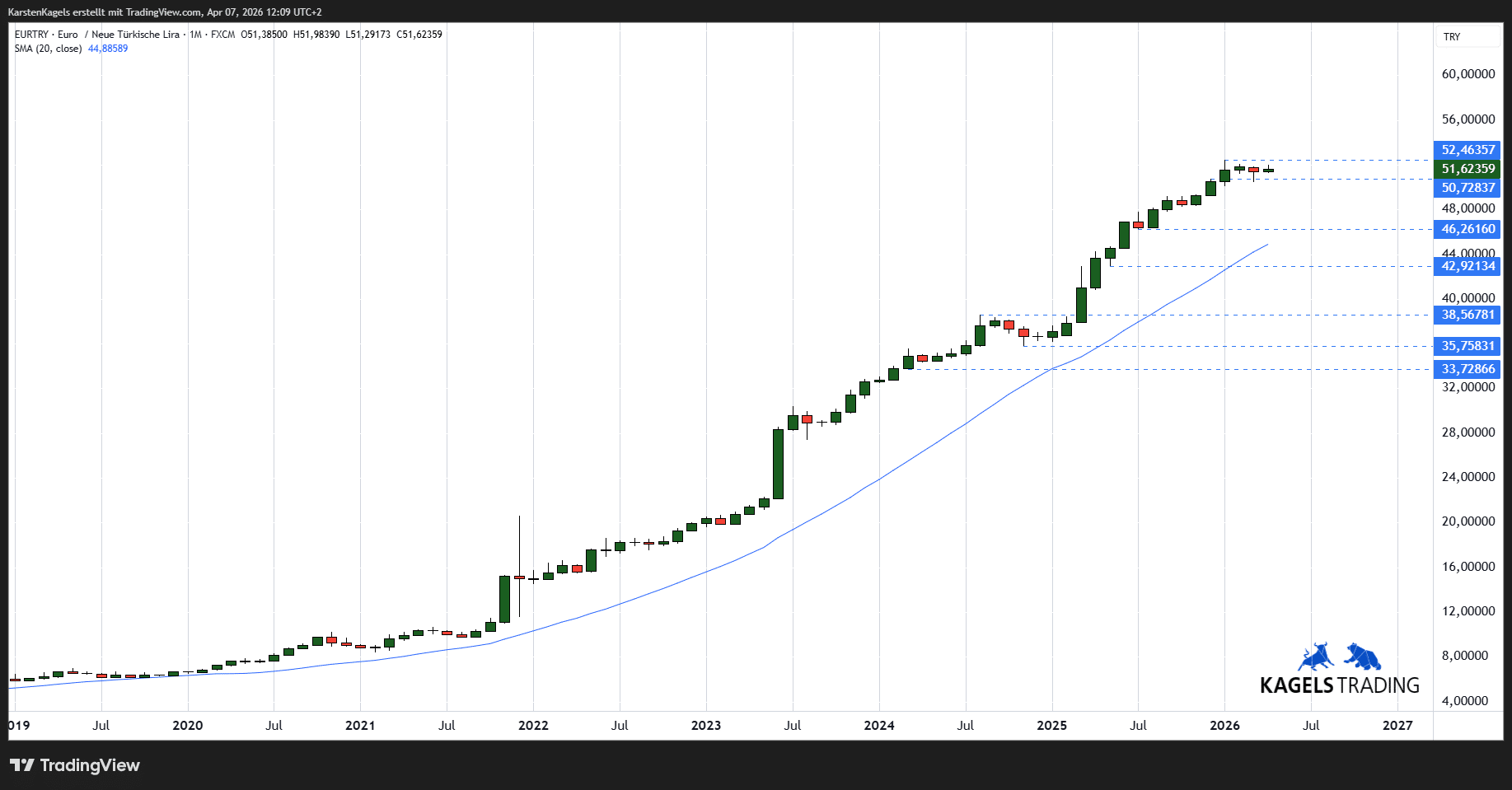 Rückblick: EUR/TRY befindet sich aus Sicht des Monatscharts in einem langfristigen Aufwärtstrend. Wir können eine konstante Abwertung der Türkischen Lira gegenüber dem Euro sehen. Im Ausbruch aus der vorangegangenen Schiebephase wurde im Januar 2026 ein Allzeithoch bei 52,46 erreicht.