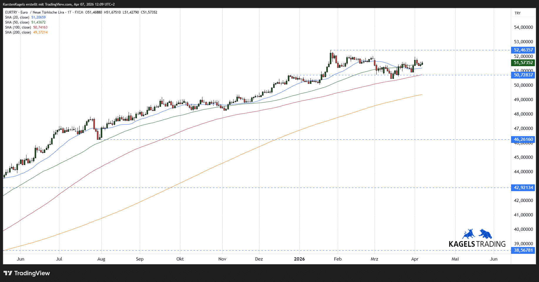 Rückblick: Im Tageschart sehen wir einen Ausbruch über das Vorjahreshoch vom 24. Dezember 2025 bei 50,72 Lira. In der Bewegung ist der Kurs an sein jüngstes Allzeithoch bei 52,46 marschiert und konsolidiert seitdem.