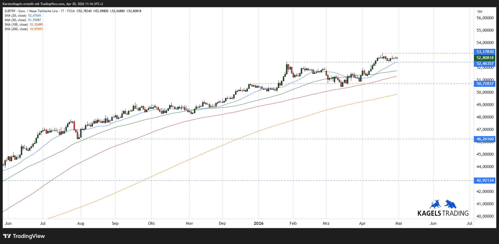 Ausblick: Grundsätzlich kann von weiter steigenden Kursen ausgegangen werden. Eine Korrektur im Aufwärtstrend würde erst dann vorliegen, wenn das Tief aus dem Juli 2025 bei 46,26 unterschritten wird. Momentan zeigt der Kurs eine Trendfortsetzung über die 50-Lira-Marke und könnte bei anhaltender Nachfragesituation bis in den 56er-Bereich laufen.