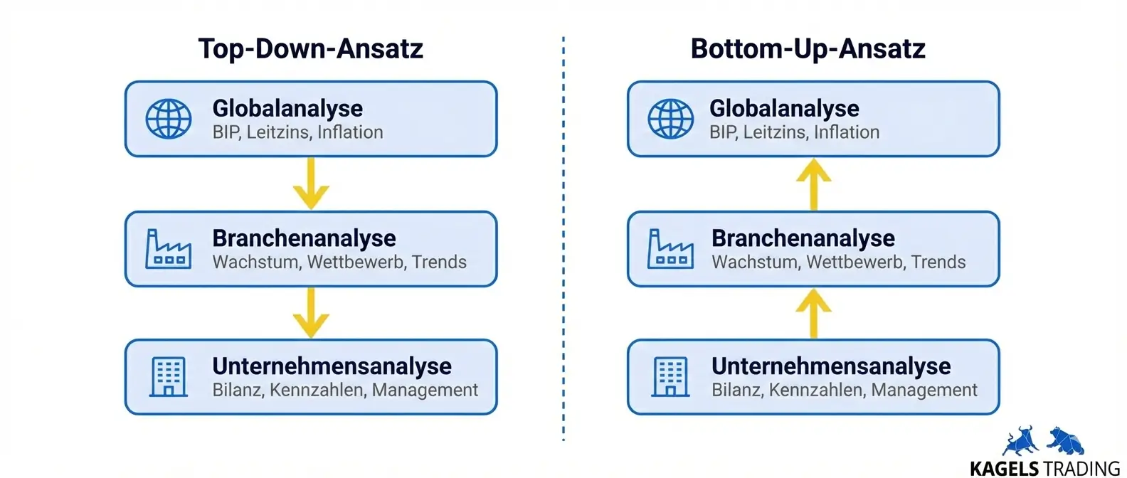 Die Fundamentalanalyse bei Aktien kennt zwei grundlegende Ansätze, die zum gleichen Ziel führen, aber an unterschiedlichen Punkten starten.