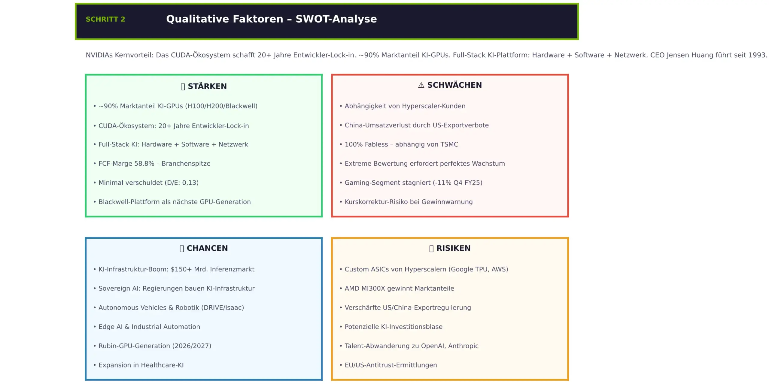 - Schritt 2: Qualitative Faktoren einordnen. Prüfe Geschäftsmodell, Wettbewerbsvorteil und Management. Professionelle Analysten nutzen dafür häufig das SWOT-Framework (Strengths, Weaknesses, Opportunities, Threats), um diese Faktoren zu strukturieren.