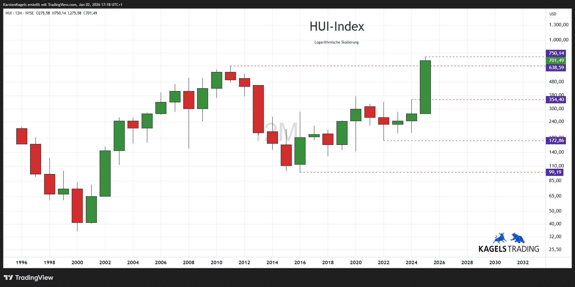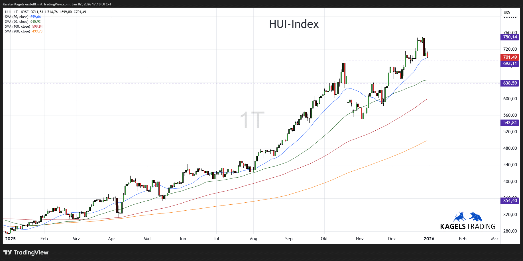 Rückblick: Die Kursentwicklung des Goldminen-Index HUI (NYSE Arca Gold Basket of Unhedged Gold Stocks) zeigt im Jahr 2025 eine stabile Rallye, die sich im zweiten Halbjahr sogar noch beschleunigt hat. In einem bis Mitte Oktober gelaufenen engen Kanal wurde sogar das bisherige Rekordhoch aus dem Jahr 2011 herausgenommen und ein neues Hoch bei $693 gesetzt. Nach einem Pullback zum Jahresende notiert der Kurs noch nahe des jüngsten Allzeithochs über der $700er-Marke.