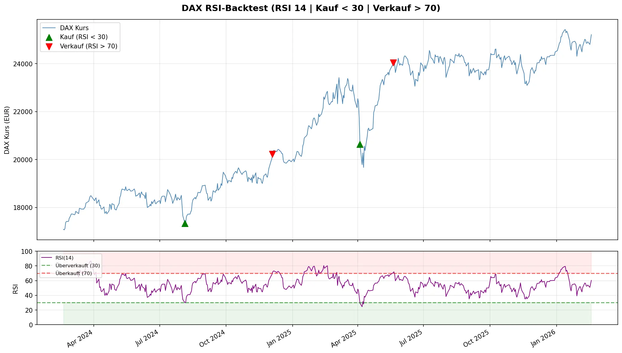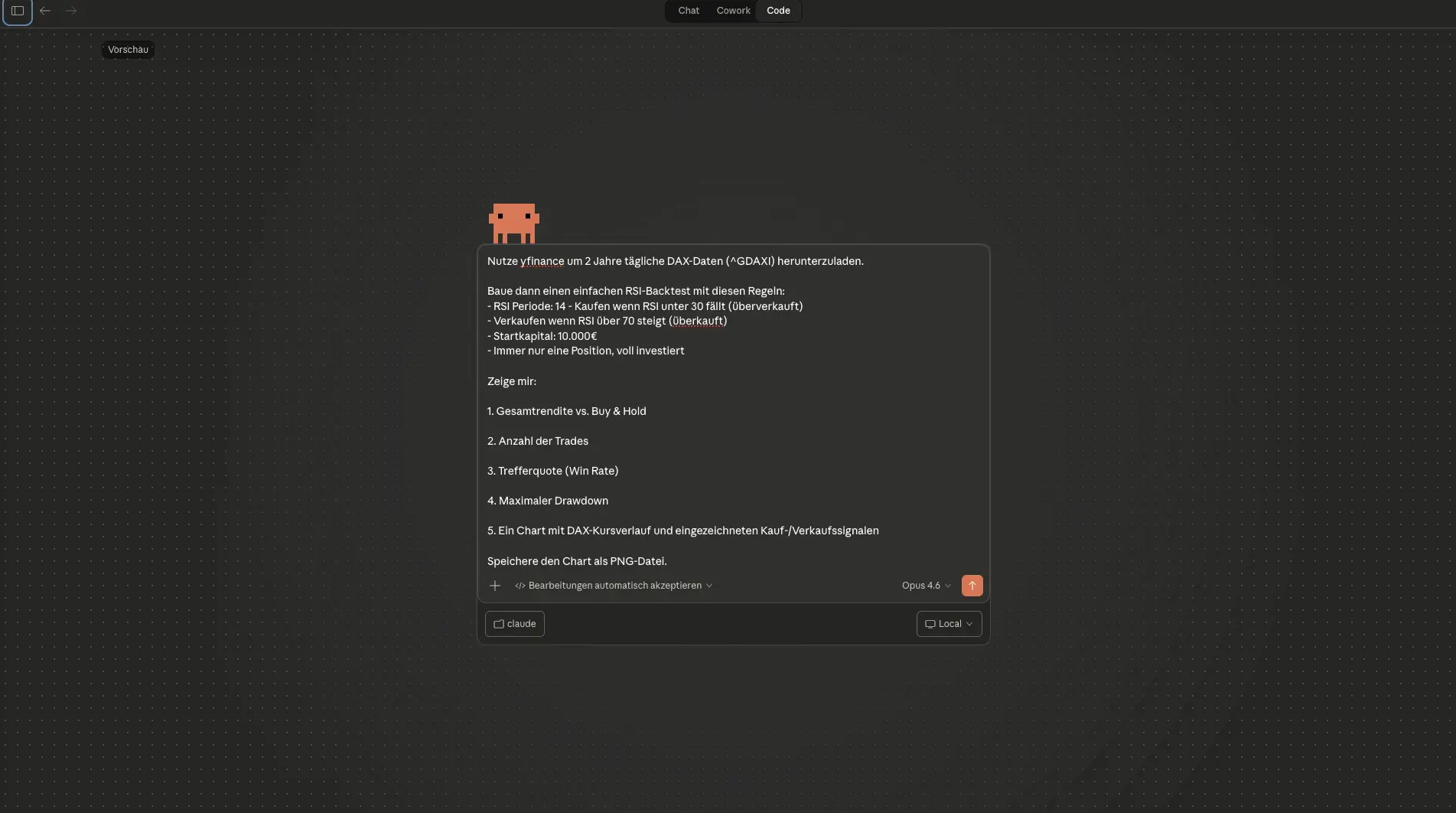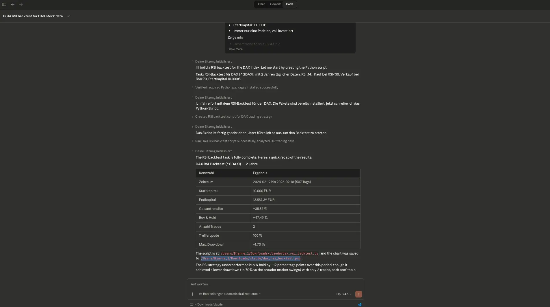 Der Prompt: Lade zwei Jahre DAX-Daten herunter, teste eine RSI-Strategie (kaufen unter 30, verkaufen über 70), 10.000 Euro Startkapital, und gib mir die Ergebnisse als Chart.