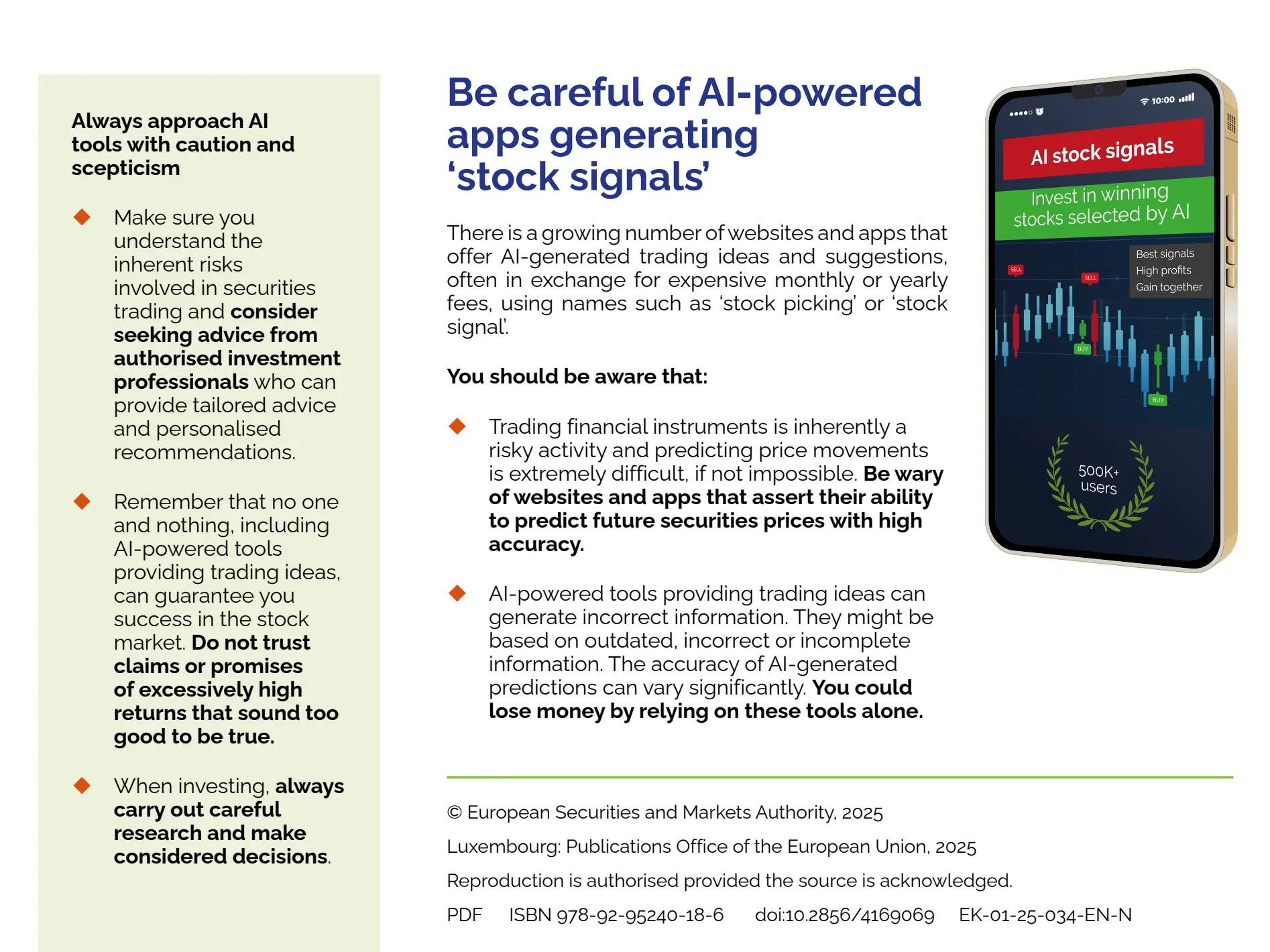 Die ESMA warnt mittlerweile europaweit vor Apps, die teure Monatsabos für angeblich KI-generierte Trading-Signale verkaufen. Und die BaFin nennt im Januar 2026 konkret WhatsApp-Gruppen mit gefälschten “Finanzexperten” und Deepfake-Videos als aktuelle Bedrohung. Über 300 Websites nutzen KI Trading als Köder.