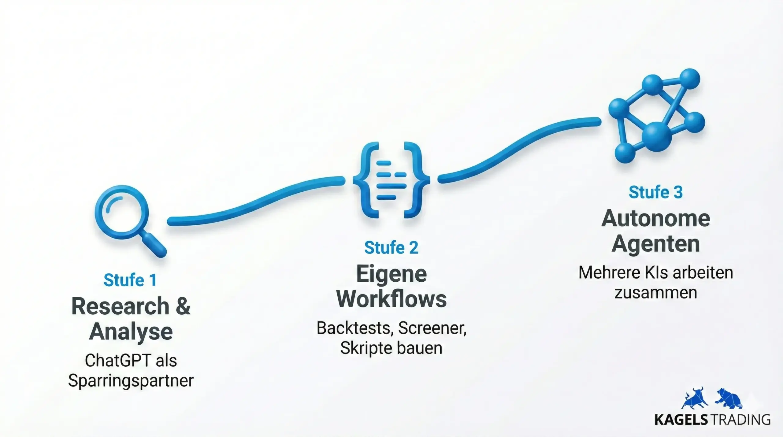 Was du mit KI im Trading machen kannst, reicht von simplen Fragen an ChatGPT bis hin zu komplexen Agenten-Systemen. Ich teile das in drei Stufen ein.
