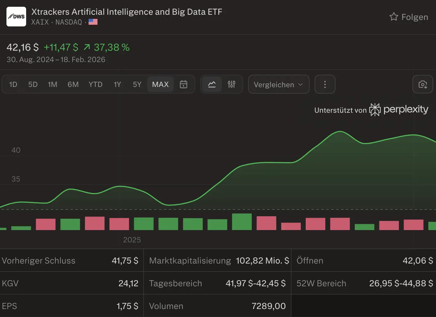 Aber verwechsle das nicht mit den KI-gemanagten Fonds von oben. Bei einem KI-ETF investierst du in Unternehmen die KI entwickeln. Bei einem KI-Fonds lässt du eine KI dein Geld verwalten, und wie die Stiftung Warentest Zahlen zeigen, funktioniert Letzteres bisher eher mäßig.
