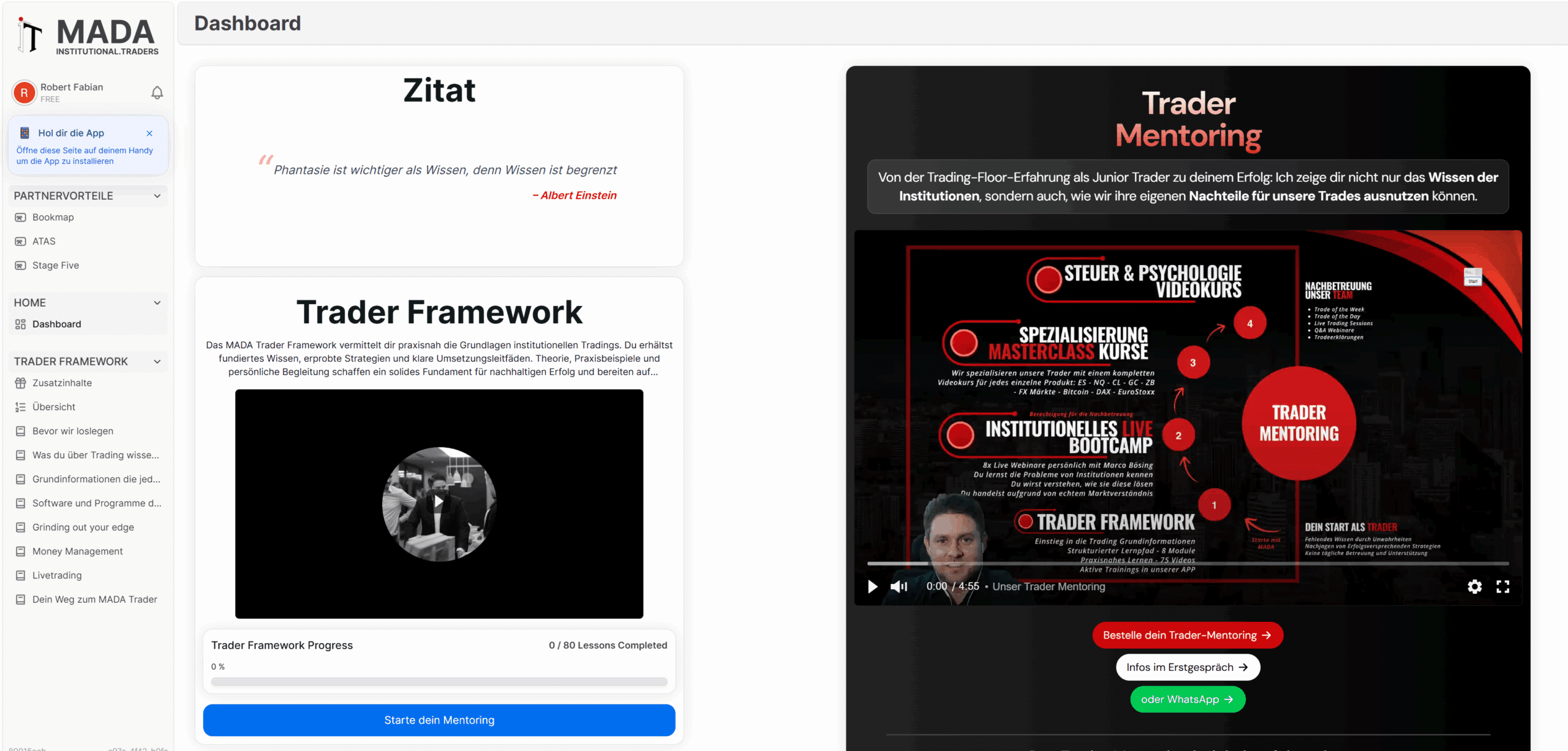Das Trader Framework bildet den kostenlosen Einstieg in die MADA-Welt. Nach einer einfachen Registrierung per E-Mail erhalten Nutzer Zugriff auf über 60 Videolektionen, strukturierte Module und praktische Übungen. Behandelt werden unter anderem: