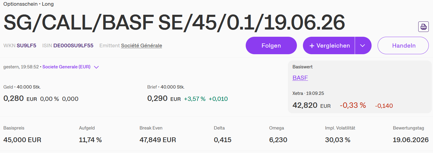 Wir sehen einen Long-Optionsschein auf die BASF-Aktie mit einer Laufzeit bis zum 18.06.2026. Dies sind ca. neun Monate ab Erstellung dieses Beispiels.