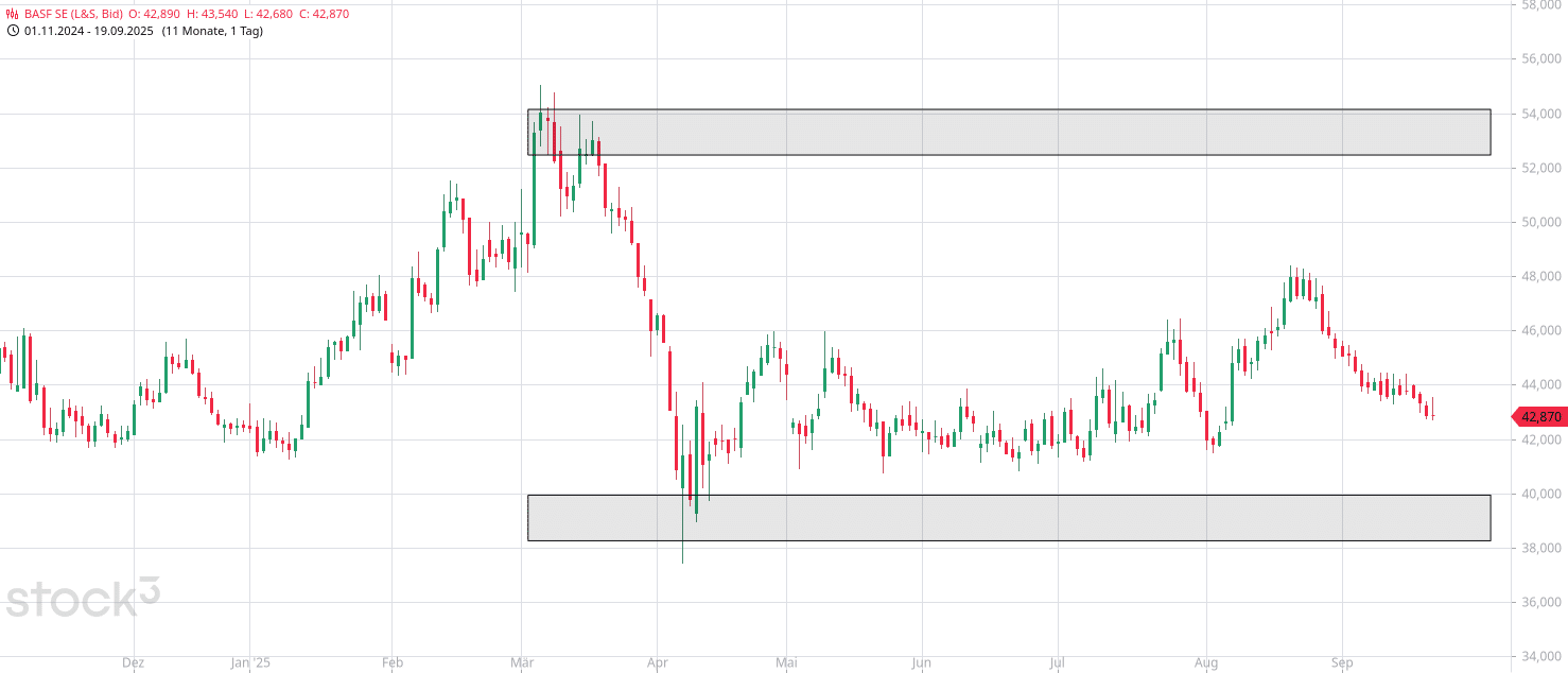 Wir sehen im Chartbild der BASF-Aktie eine Unterstützungszone bei ca. 40 € und eine Widerstandszone in der Region von ca. 53 €. Diese Werte merken wir uns für den Optionsscheinrechner vor. Der aktuelle Kurs der BASF-Aktie liegt bei ca. 43 €.