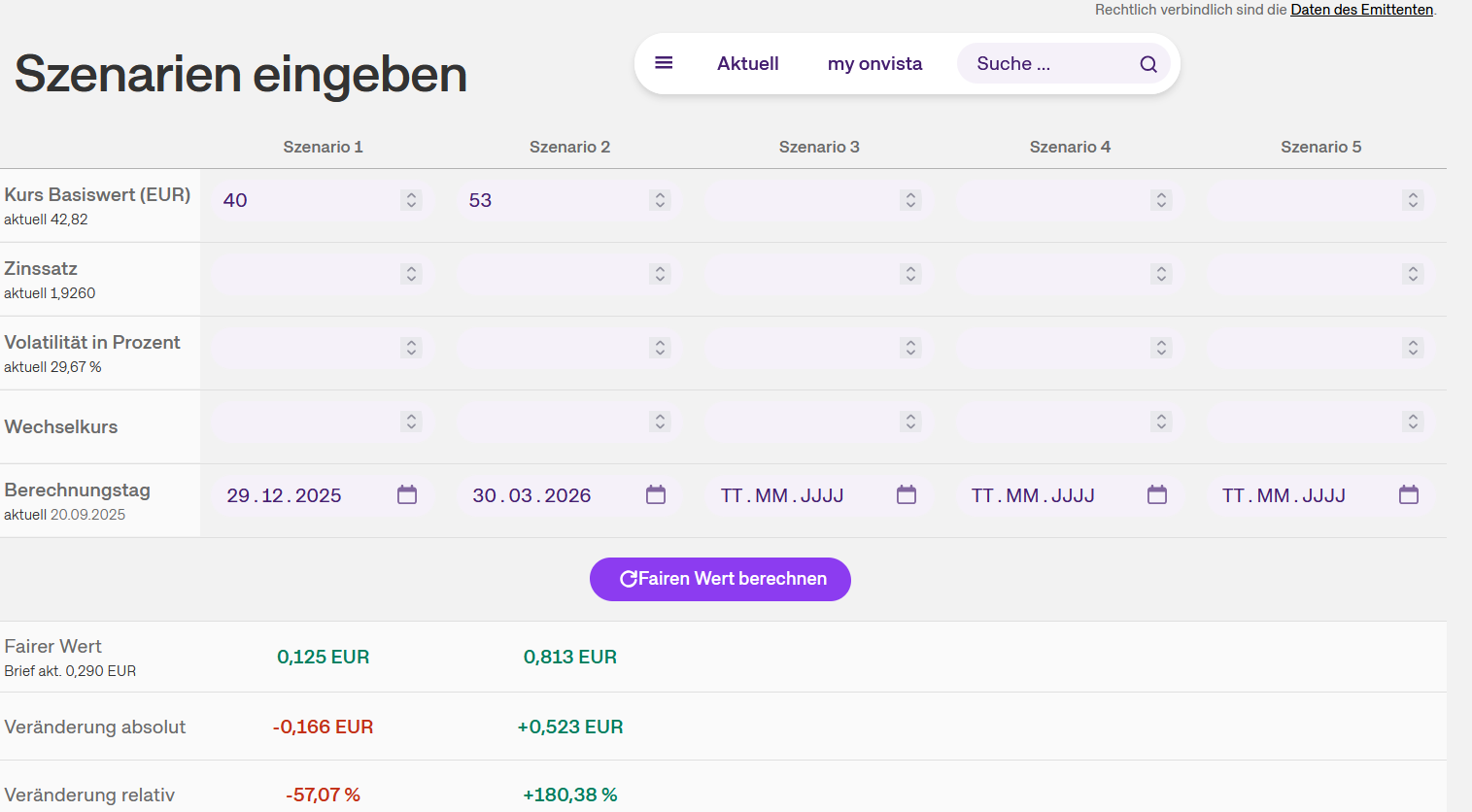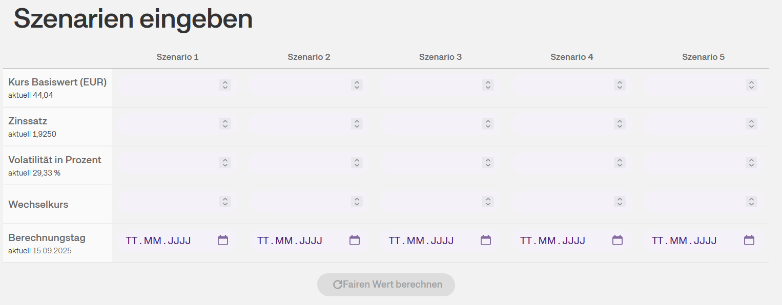 Nach Eingabe der WKN bzw. ISIN des Optionsscheines öffnet sich die Berechnungsseite für Optionsscheine. Dort besteht die Möglichkeit, bis zu fünf Szenarien gleichzeitig berechnen zu lassen.