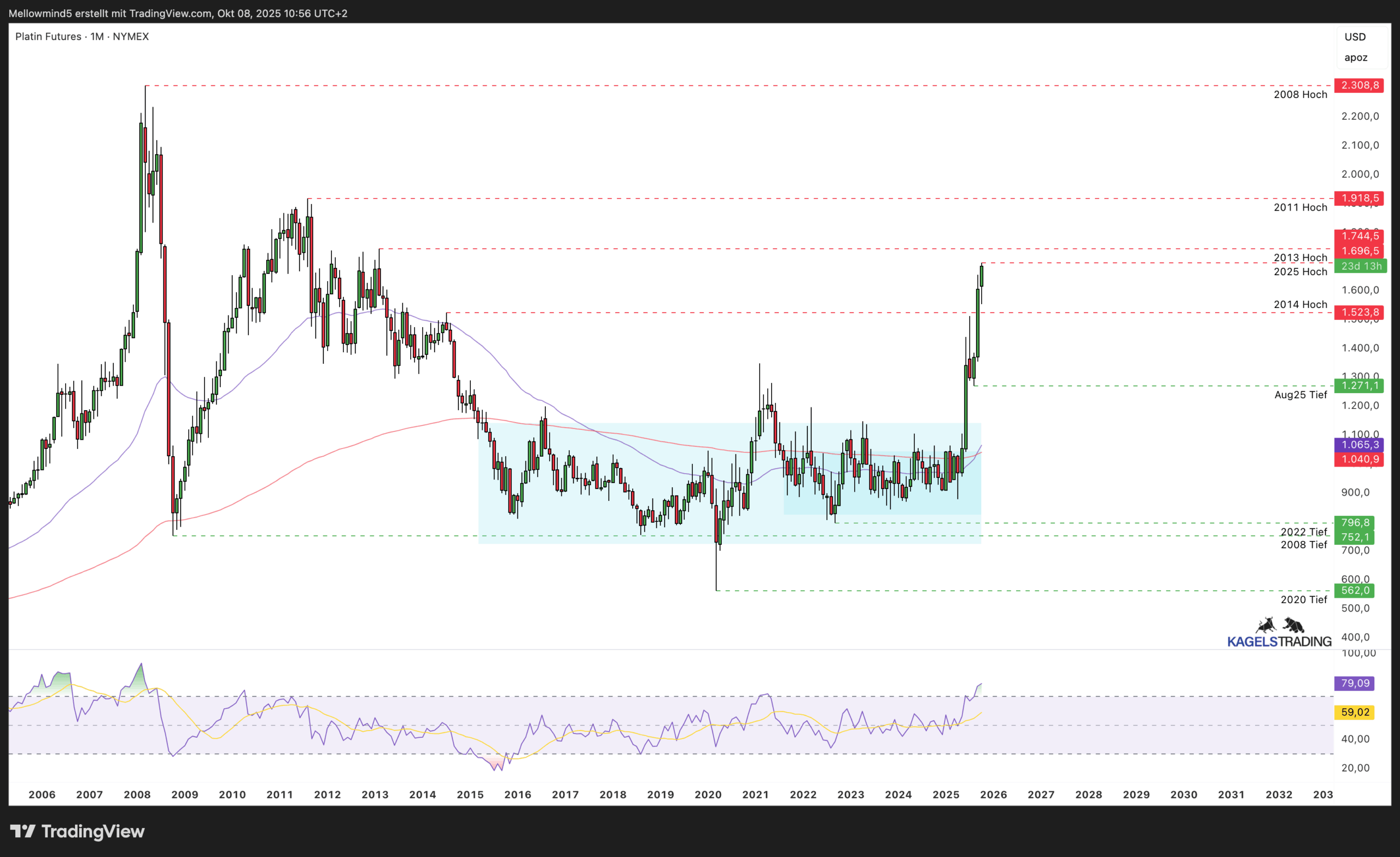 Was technisch besonders ins Auge fällt: Der 50-Monats-SMA (lila) hat den 200-Monats-SMA (rot) von unten nach oben gekreuzt. Ein klassisches Golden Cross. Das gilt als eines der stärksten langfristigen Kaufsignale, und beide gleitenden Durchschnitte zeigen jetzt nach oben. Platin hat einen strukturellen Trendwechsel vollzogen.
