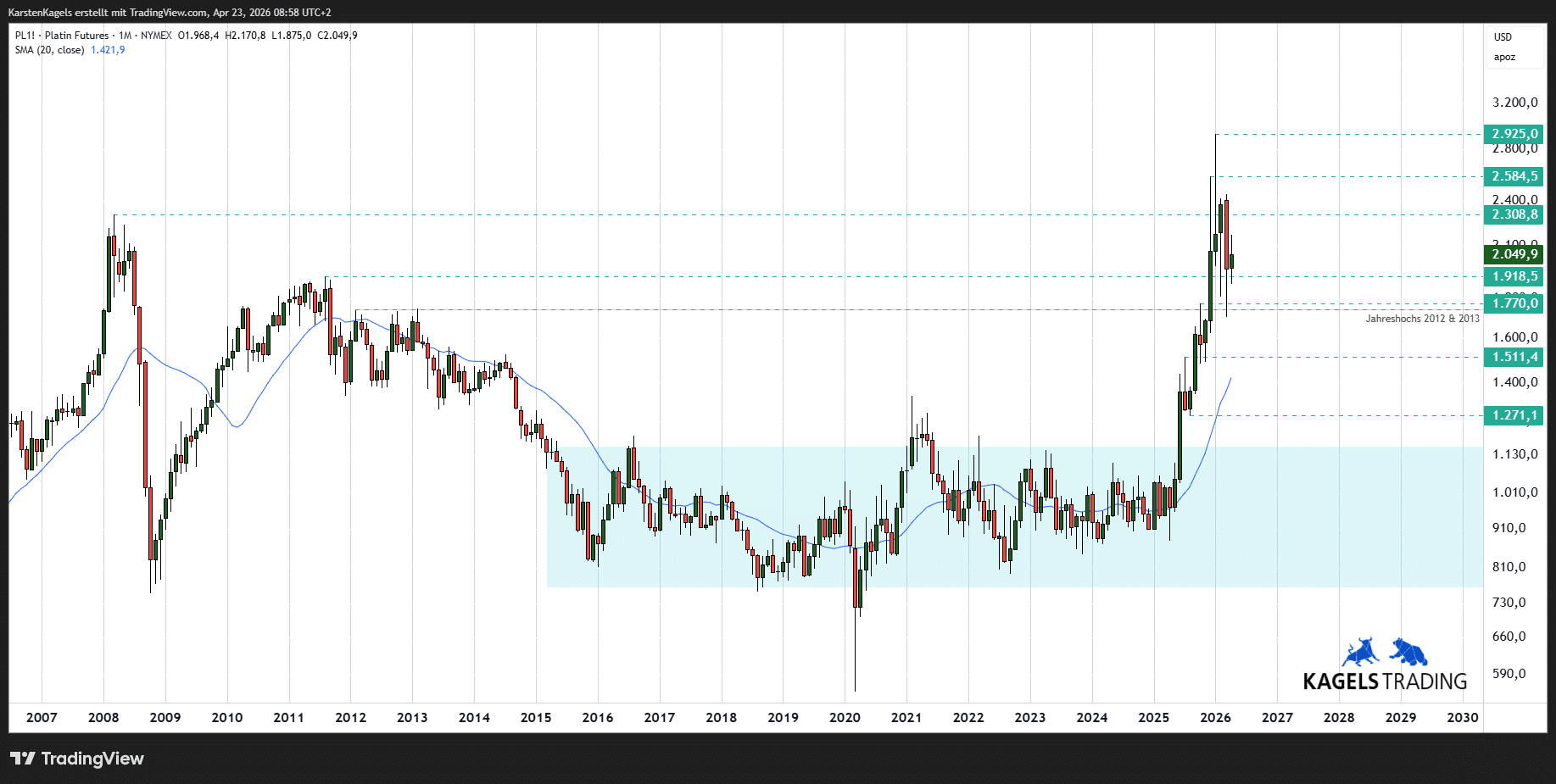 Der Platinpreis befindet sich in einem Ausbruchsszenario aus der seit 2015 abgearbeiteten Konsolidierung und notiert aktuell bei $2.045. Die signifikanten Hochs der zurückliegenden Jahre wurden damit überwunden und dürften Korrekturimpulse stützen. Übergeordnet sollte beachtet werden, dass der Kurs darum ringt, auch die große Handelsspanne des Jahres 2008 nach oben zu verlassen.