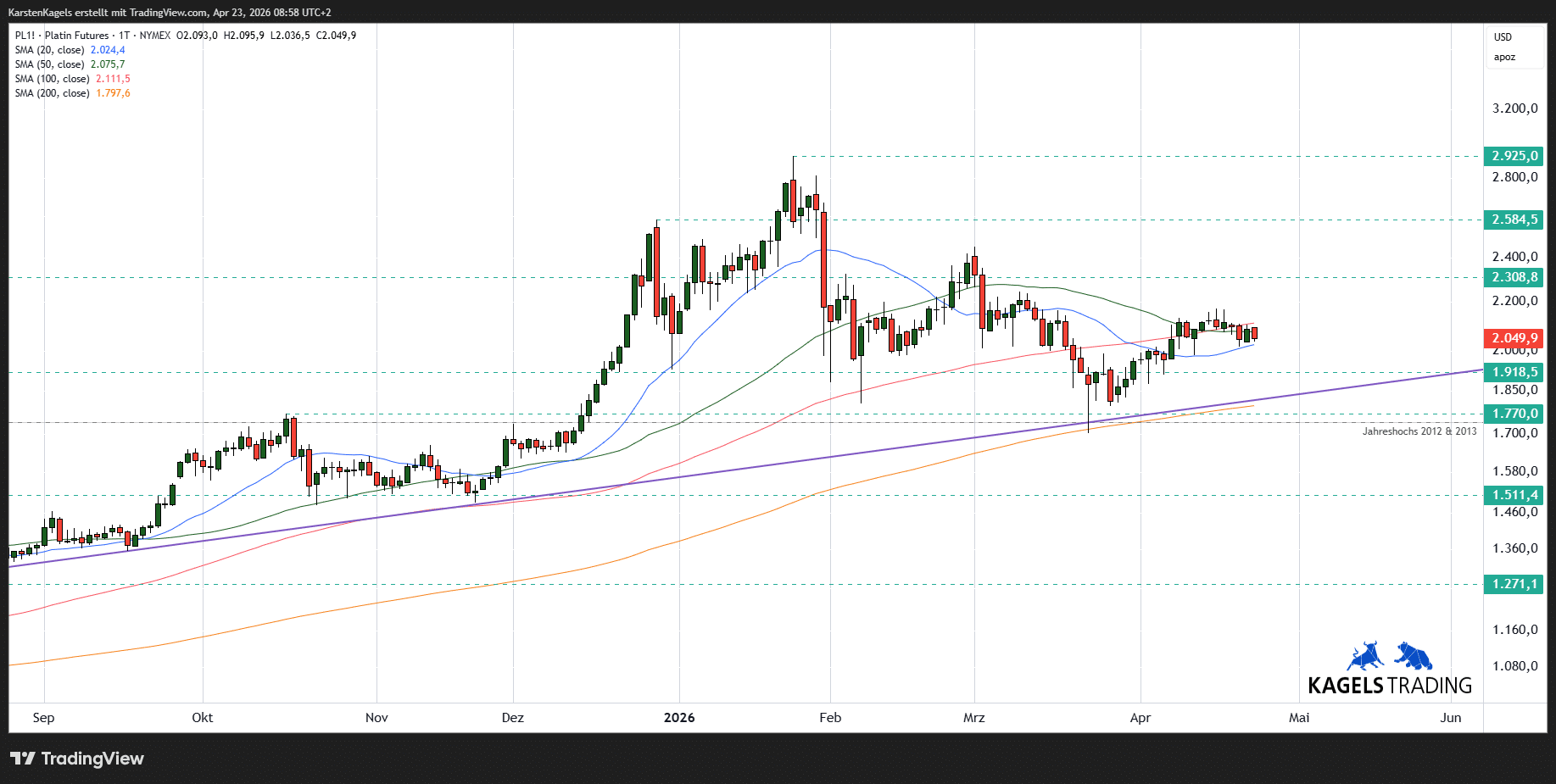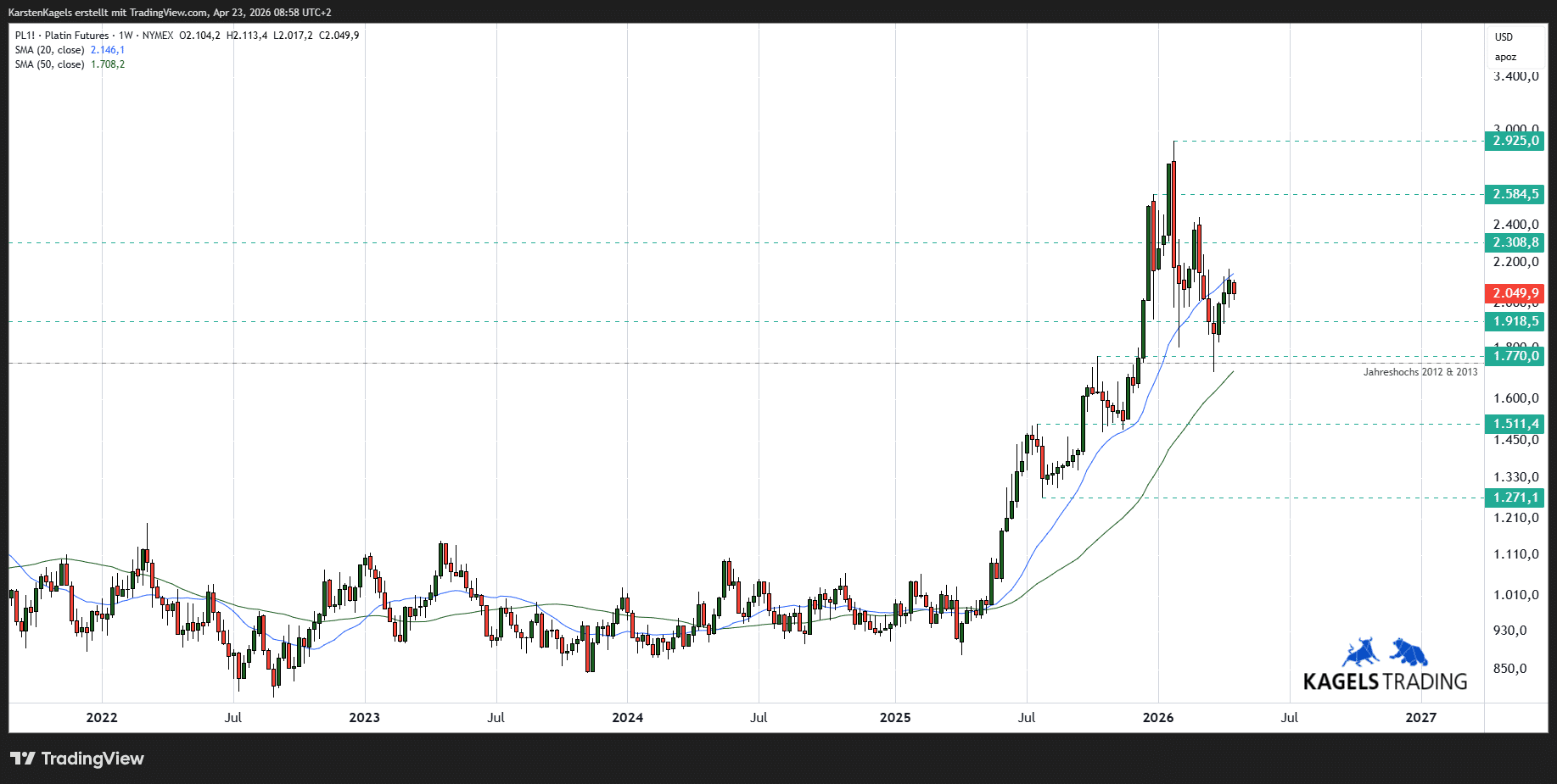 Platin notiert aktuell bei $2.045, nachdem der Preis vom neuen Allzeithoch bei $2.925 zurückgekommen ist. Für eine Korrektur bildet der Bereich zwischen $1.730 und $1.770 eine wichtige Unterstützungszone.