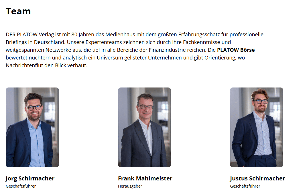 Mit über 80 Jahren auf dem Buckel zählt der PLATOW Verlag zweifelsohne zu den Medienhäusern mit weitreichenden Erfahrungen im Hinblick auf sämtliche Bereiche der Finanzbranche. Hier ein kurzer Überblick über die aktuellen führenden Köpfe hinter dem Unternehmen: