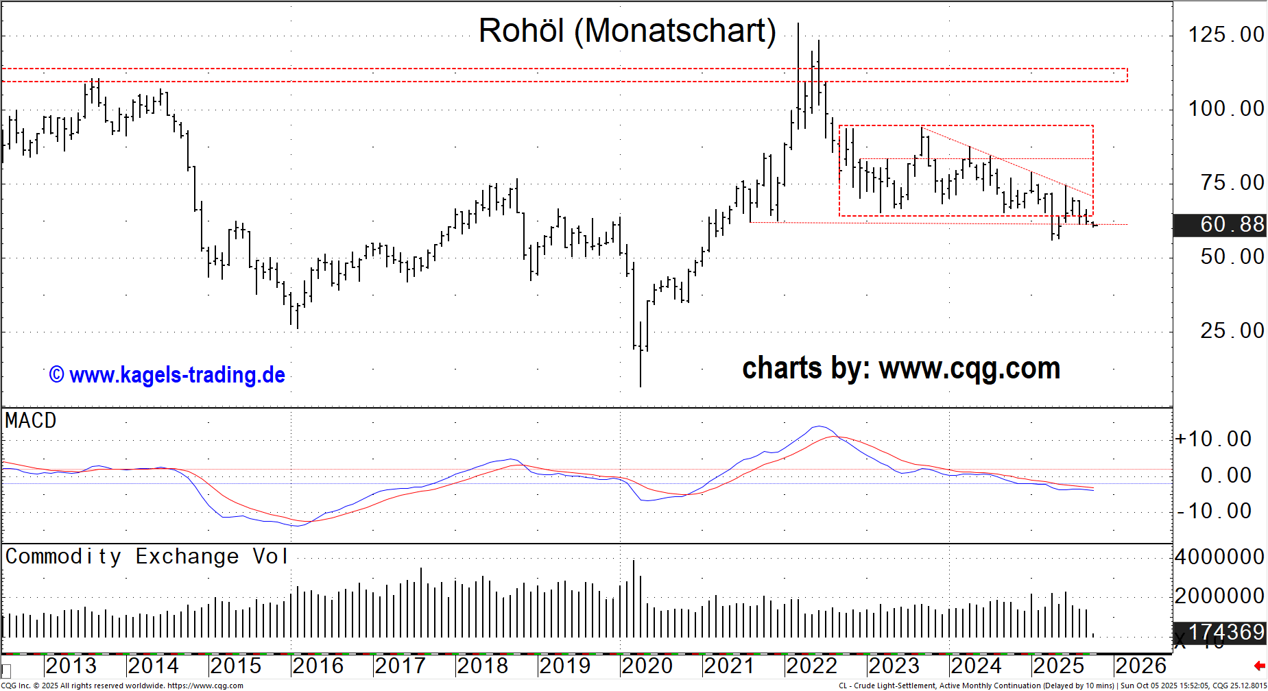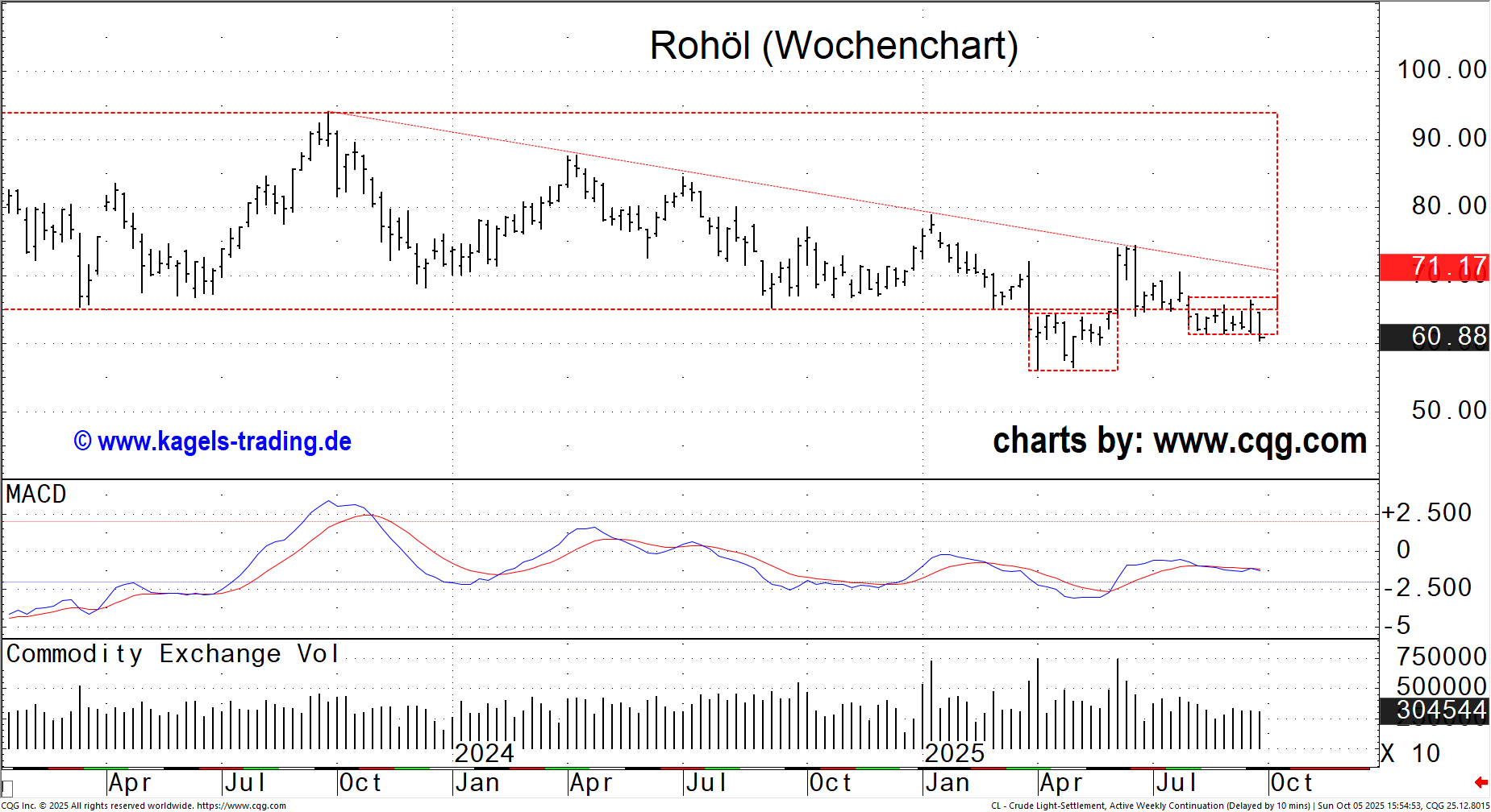 In der abgelaufenen Börsenwoche hat der WTI Future gleich zu Beginn des Oktobers den 11er-Innenstab auf Quartalschart und gleichzeitig den 21er „Volabar“ auf Monatschart unterschritten. Damit wurden erneut Verkaufssignale in Trendrichtung generiert.