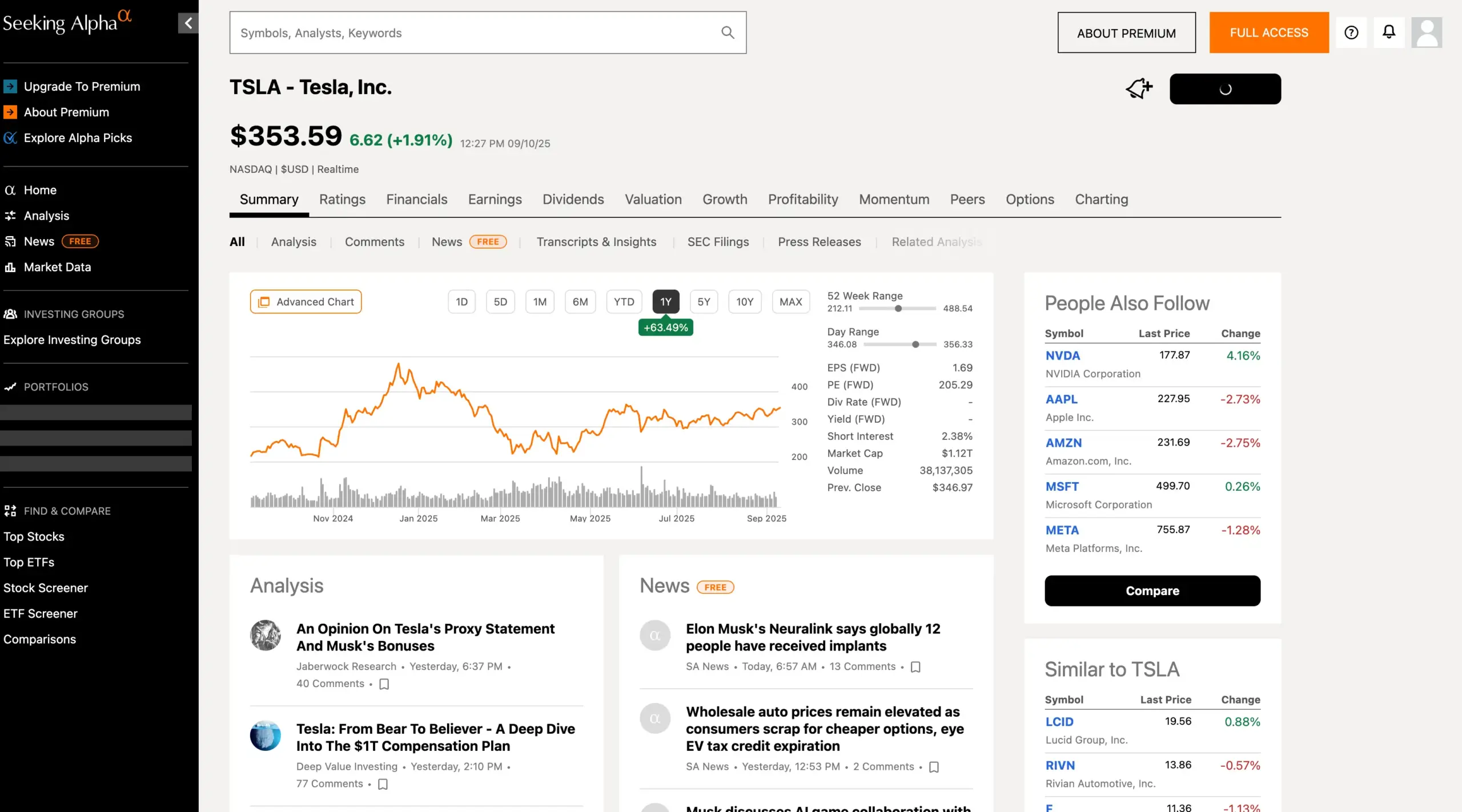 Tesla als Beispiel für die Analysentiefe von Seeking Alpha. Täglich erscheinen mehrere neue Research-Pieces – von bullishen “Tesla: Production Ramp Success” Artikeln bis zu kritischen Management-Bewertungen. Die Seitenleiste zeigt verwandte Aktien anderer Tesla-Investoren, von NVIDIA bis Microsoft, was zusätzliche Investmentideen generiert.
