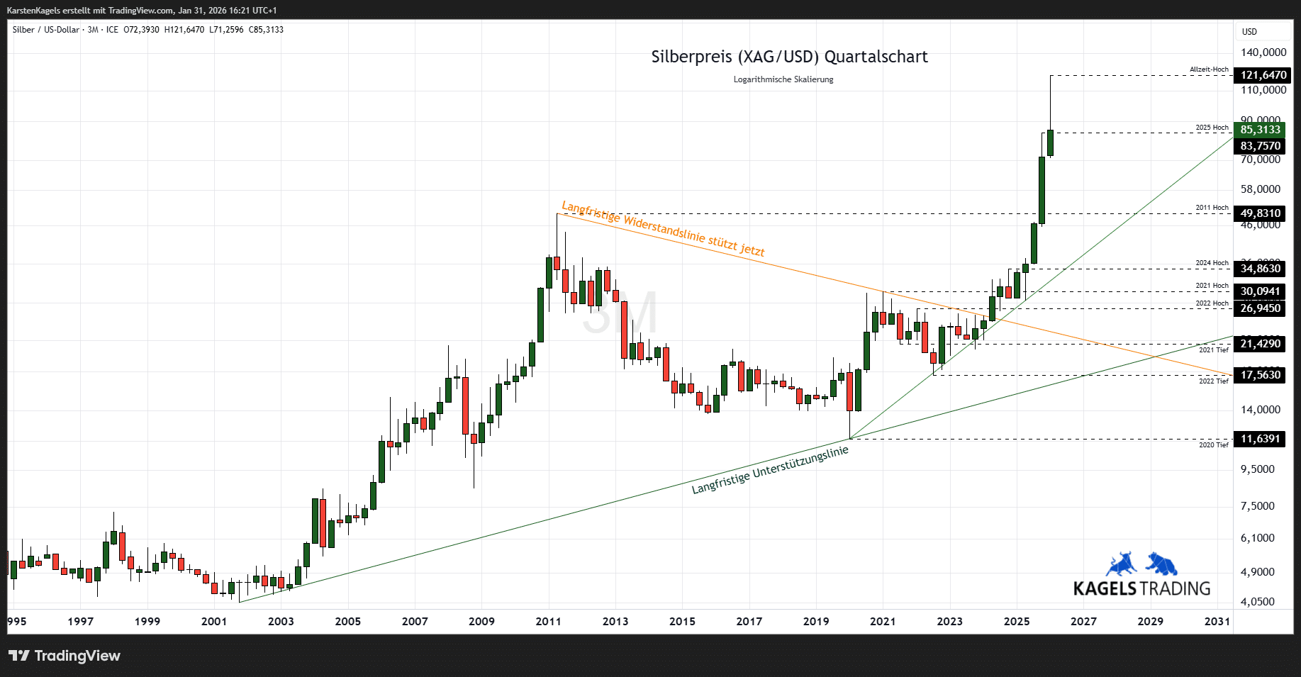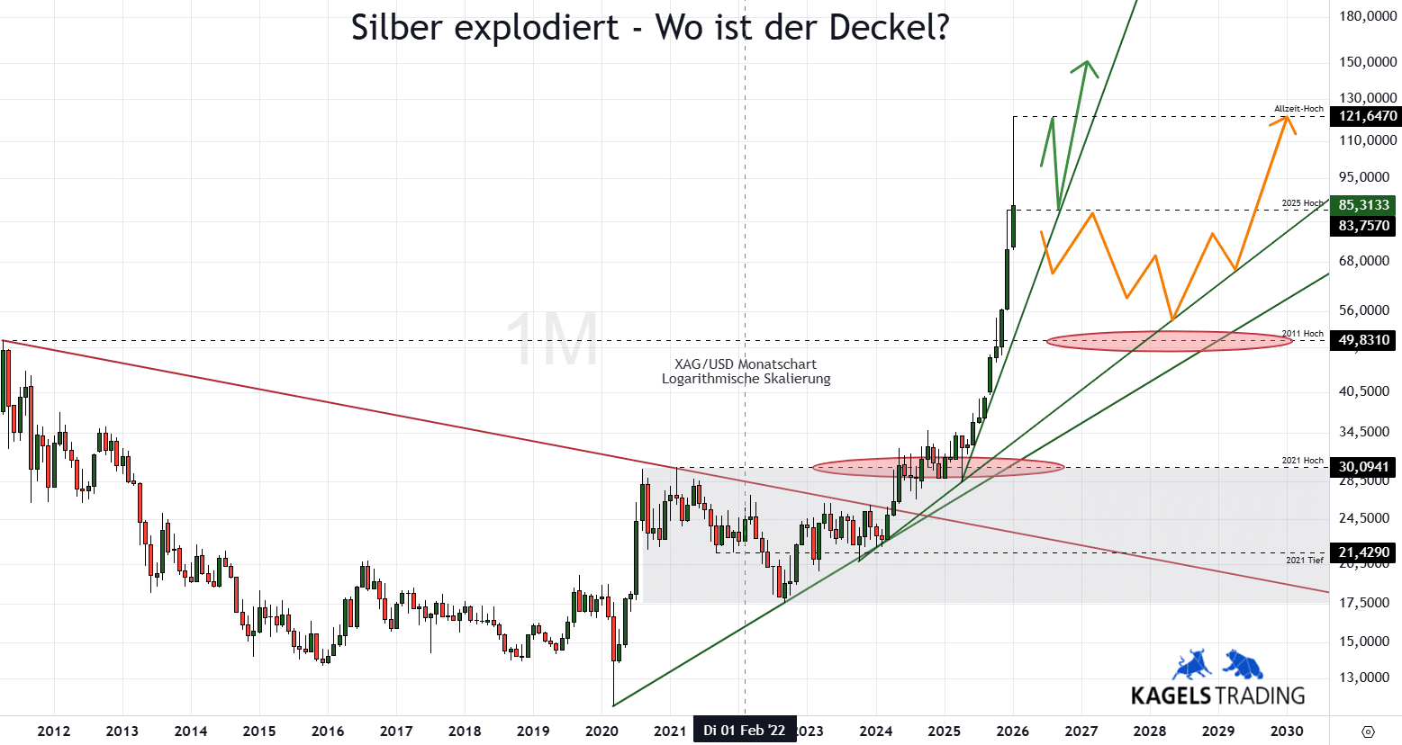 Da die langfristige Widerstandslinie im Jahr 2024 überwunden wurde, dürften steigende Kurse den Silbermarkt dominieren. Die Rekordkerze aus 2025 könnte in Verbindung mit dem neuen Hoch aus 2026 noch zu Anschlussdynamik führen, die in den folgenden Jahren deutlich höhere Kursziele anvisieren dürfte. Dabei wären Notierungen um $160 realistisch.