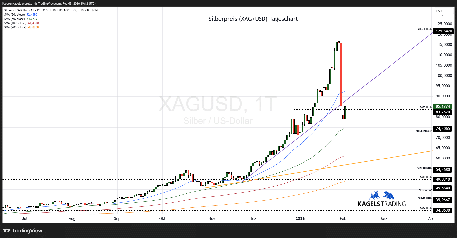 Update der Silberpreis-Prognose und Chartanalyse am 03.02.26 bei $85,17